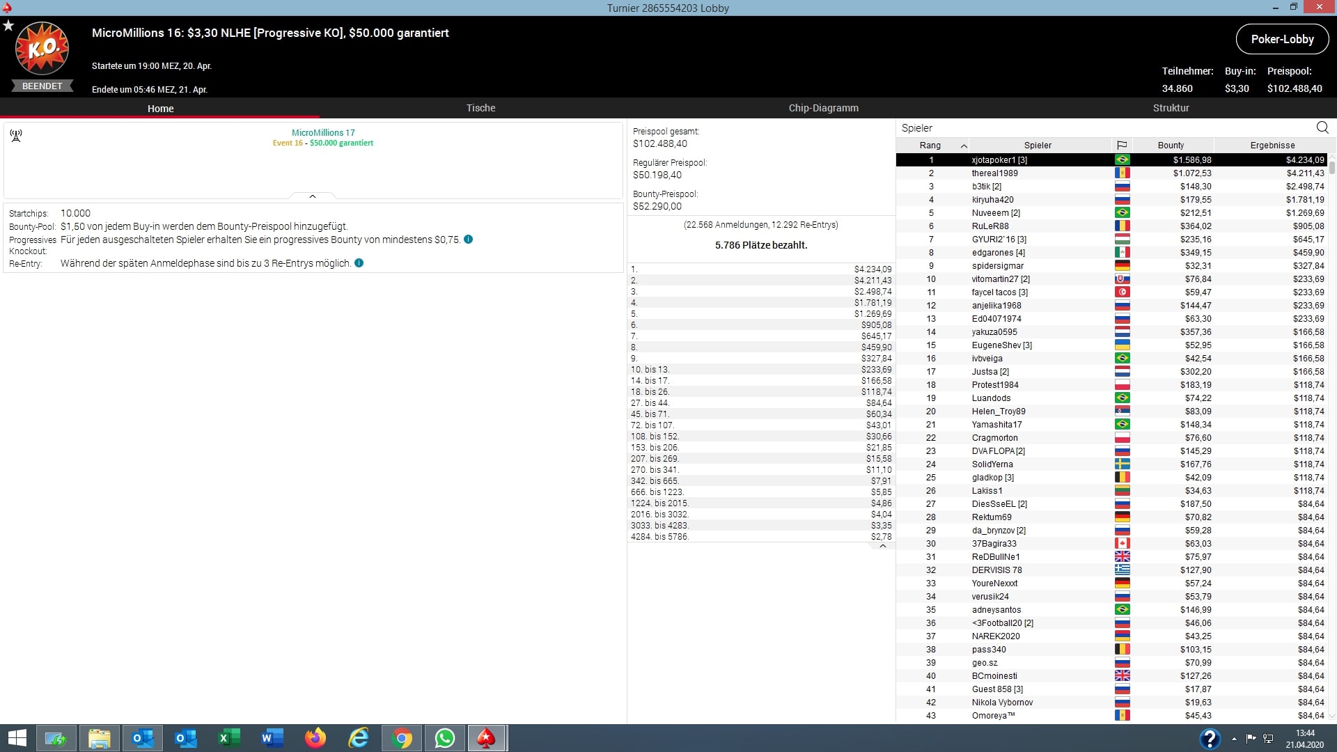 Den größten Cash des Tages konnte „xjotopoker1“ aus Brasilien beim $3,30 NLH Pko einfahren. Er setzte sich gegen 34.859 Gegner durchsetzen und gewann das Turnier für ein Preisgeld von $4.234 + $1.586 Bounties.