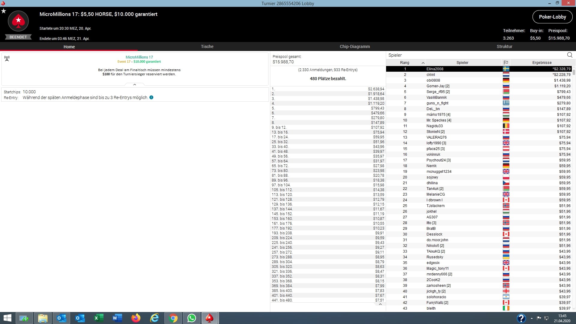 | Fr, 24. Apr | 13:30 | 64 | NLHE Turbo | $3,30 | $8K |