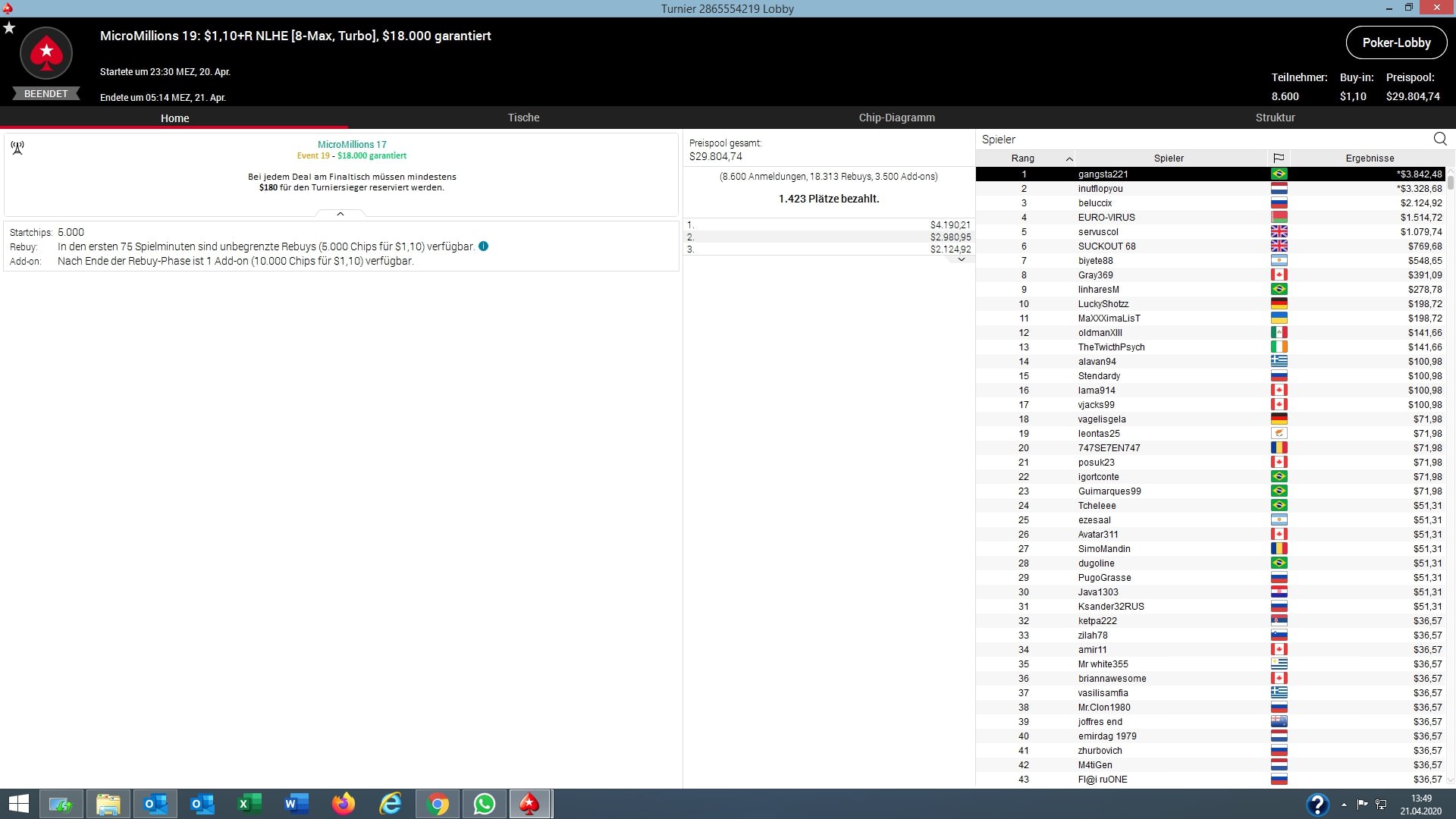 | Fr, 24. Apr | 20:30 | 69 | NLO8 6-Max, PKO | $5,50 | $20K |