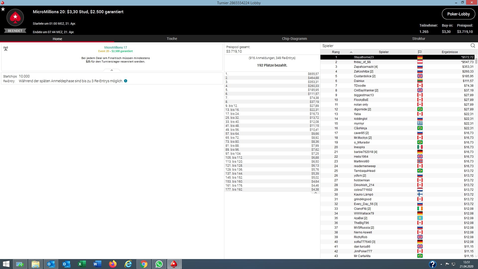 | Sa, 25. Apr | 02:00 | 73 | NLHE | $1,10 | $3K |