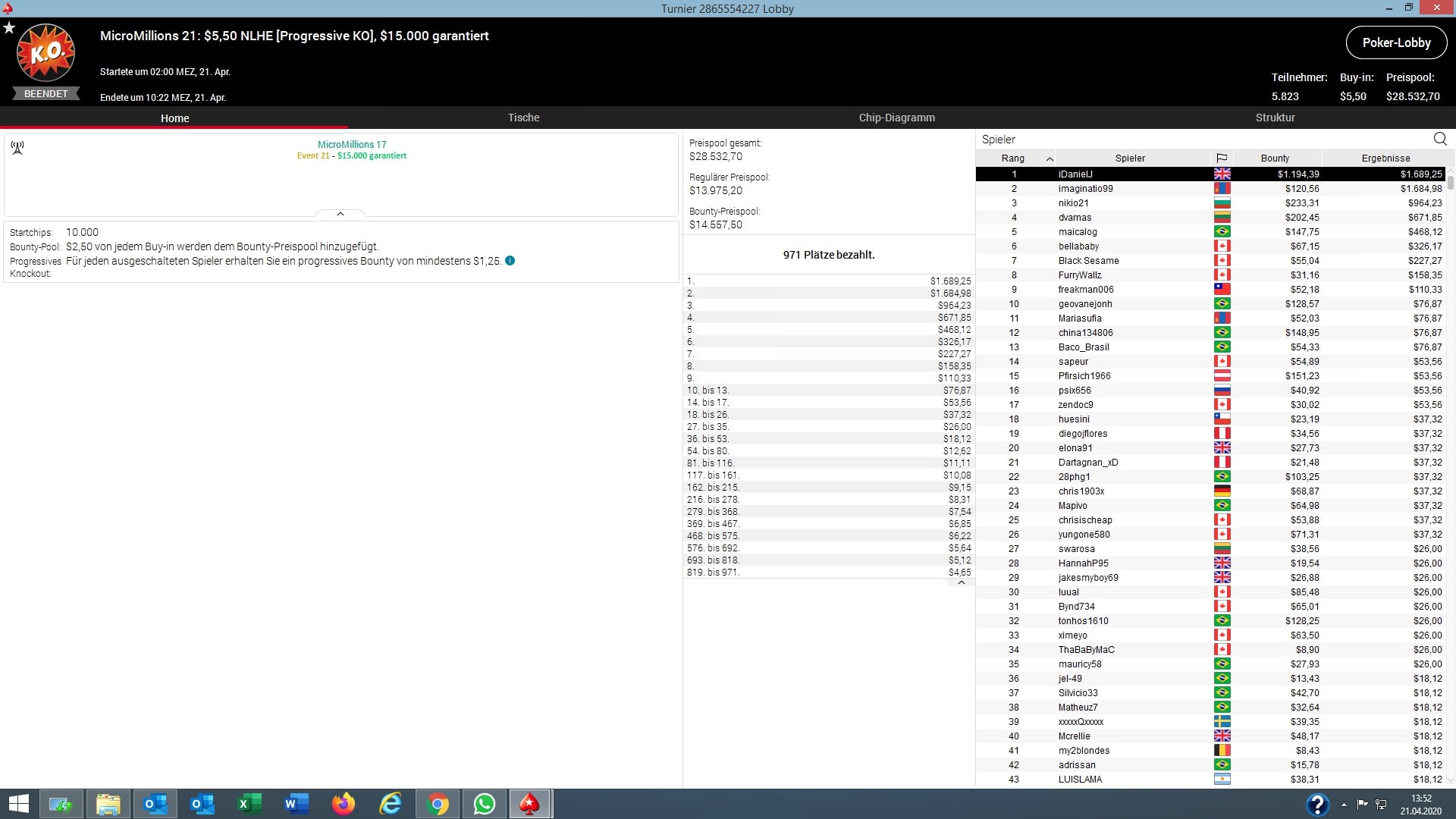 | Di, 21. Apr | 23:30 | 32 | NLHE Turbo, PKO | $3,30 | $15K |