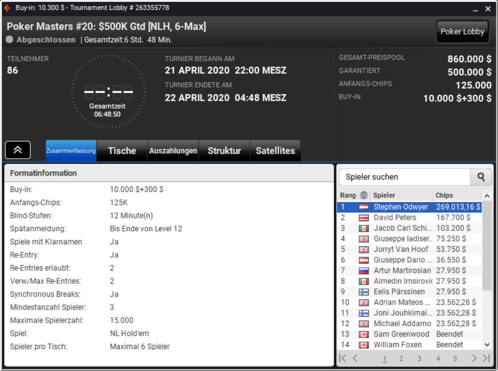 Beim zweiten Turnier des Tages, dem $10.300 NLH 6-Max Event #20, kamen 86 Entries zusammen und es ergab sich Preisgeld von $860.000. Leider gab es auch hier keinen Cash für einen deutschsprachigen Spieler.
