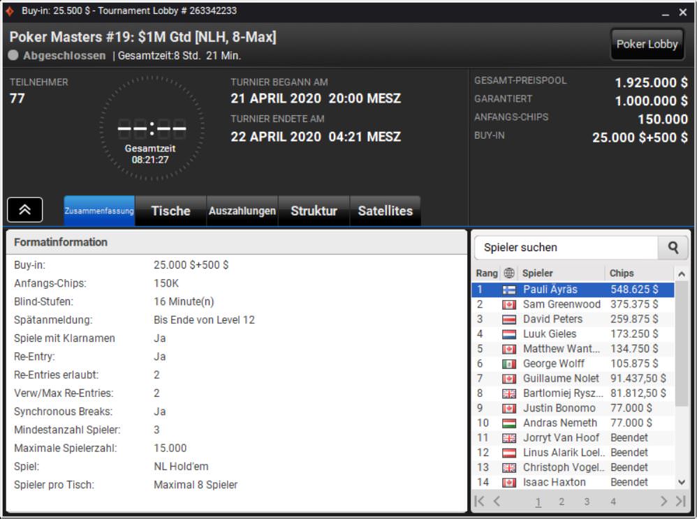 Das $25.500 NLH 8-Max Event #19 zog 77 Spieler an die virtuellen Tische und somit wurde eine stolze Summe von $1.925.000 ausgespielt, die Garantie von einer Million Dollar also knapp verdoppelt.