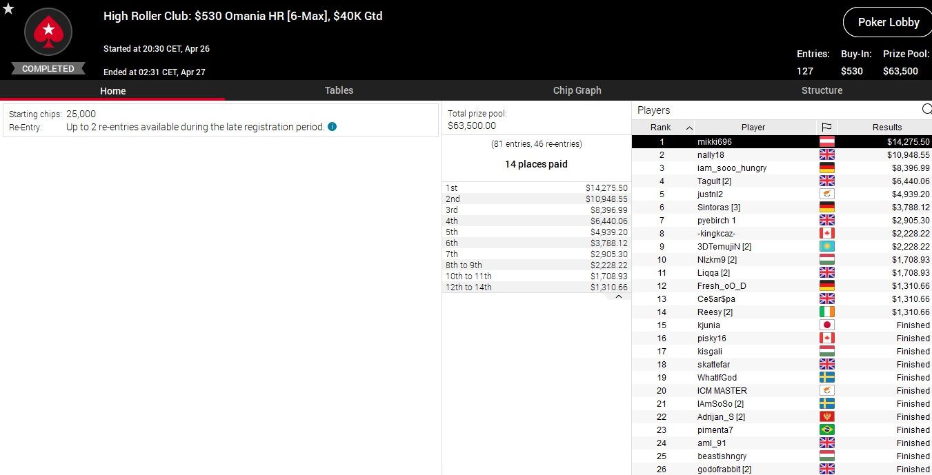 Ein Buy-In reichte dagegen Maxi „mikki696“ Lehmanski, um den Sieg beim $530 Omania Highroller einzufahren und gut $14.000 Preisgeld zu kassieren.