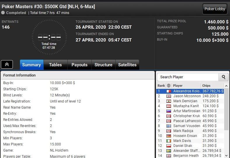 Den Sieg holte sich aber der Grieche Alexandros Kolonias, der den Briten Jason McConnon im Heads-Up bezwingen und knapp $368.000 gewinnen konnte.
