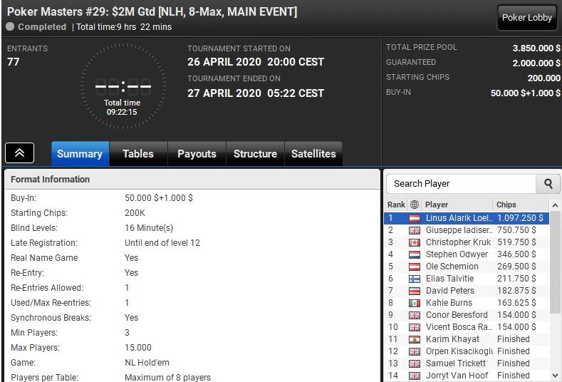 Zum Abschluss der erstmals online auf partypoker ausgetragenen Poker Masters stand gestern das Main Event an.