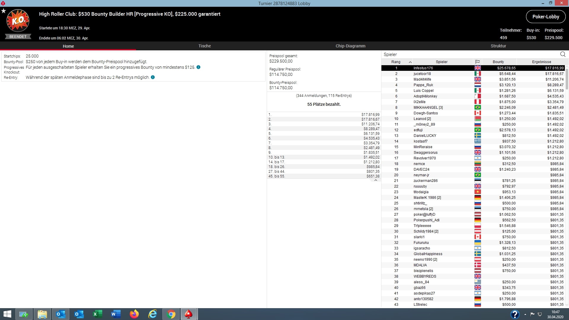 Arseniy „josef_shvejk“ Karmatsky (RUS/GBR) triumphierte beim $530 Bounty Builder HR Late Edition und kassierte $5.754 + $7.687. Der Deutsche „Grandl“ freute sich hier über Platz 4 und $1.336 + $812.
