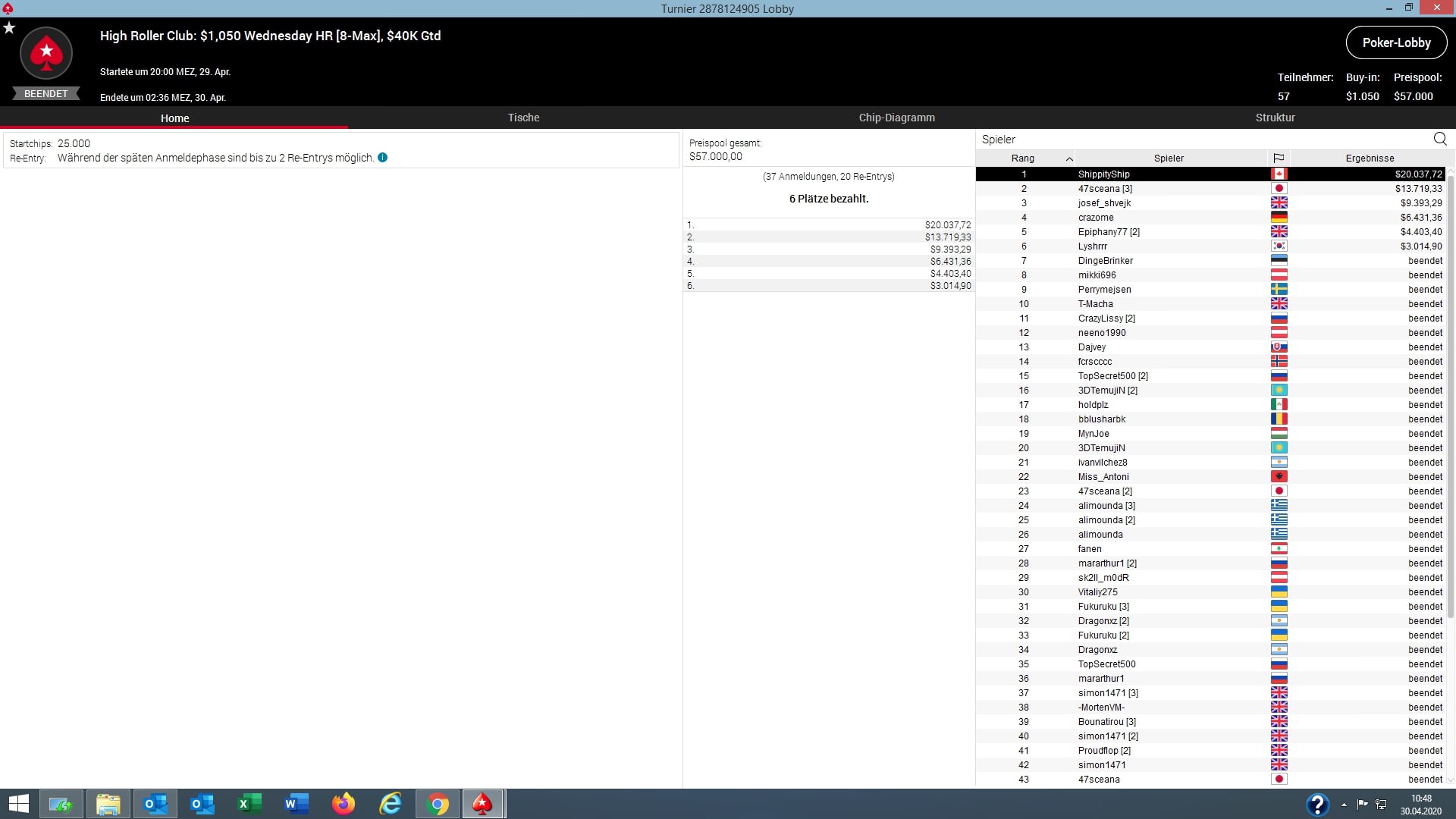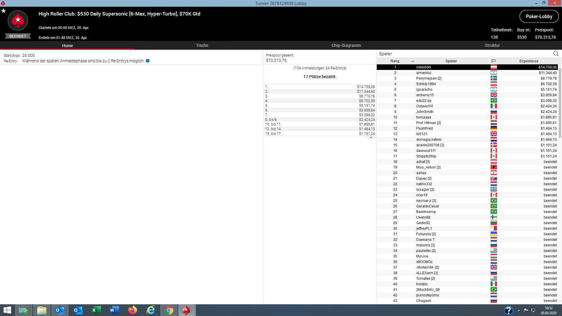 Im High Roller Club konnte die DACH-Gemeinde am Mittwoch einen weiteren Sieg verbuchen. Maxi „mikki696“ Lehmanski (GER/AUT) konnte sich beim $530 Daily Supersonic im Heads-Up gegen den Argentinier „armenioz“ durchsetzen und das Turnier für ein Preisgeld von $14.759 gewinnen. Platz 4 ging hier an Alexander „Schildy1984“ Debus (GER/AUT) für $6.702. Dann belegte noch „FlushFred“ (GER) den Platz 12 für $1.484.