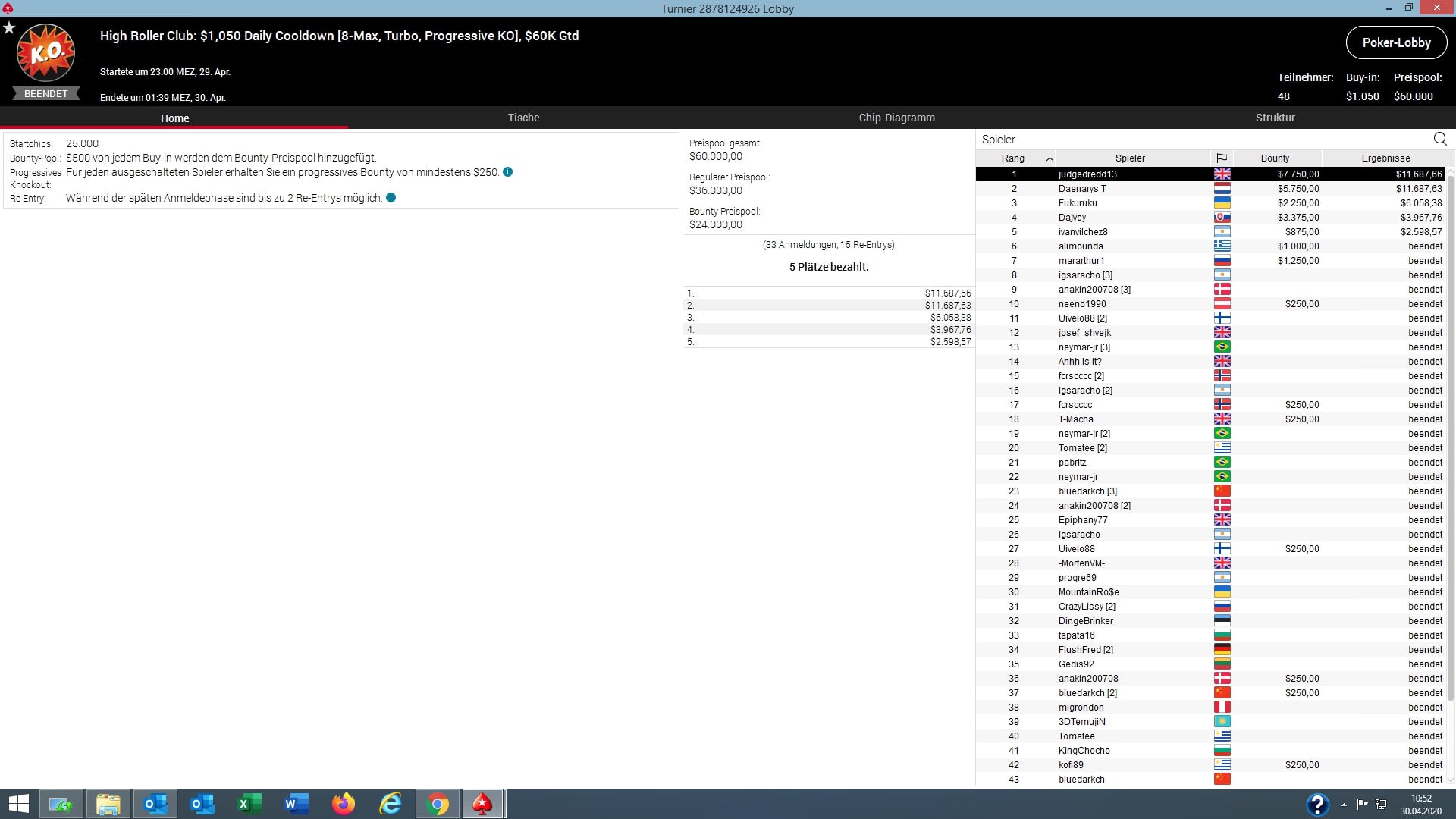 Dann gab es noch Siege für Dan „judgedredd13“ Charlton (GBR) beim $1.050 Daily Cooldown für $11.687 + $7.750 Bounties und „Infestus176“ (GBR) beim $530 Bounty Builder für $17.816 + $25.678 Bounties.