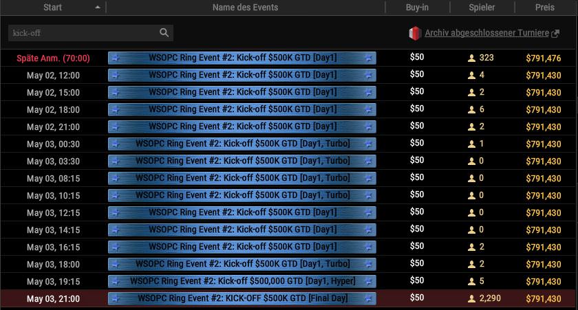 Die noch ausstehenden Starttage für das $50 WSOPC Kick-off: