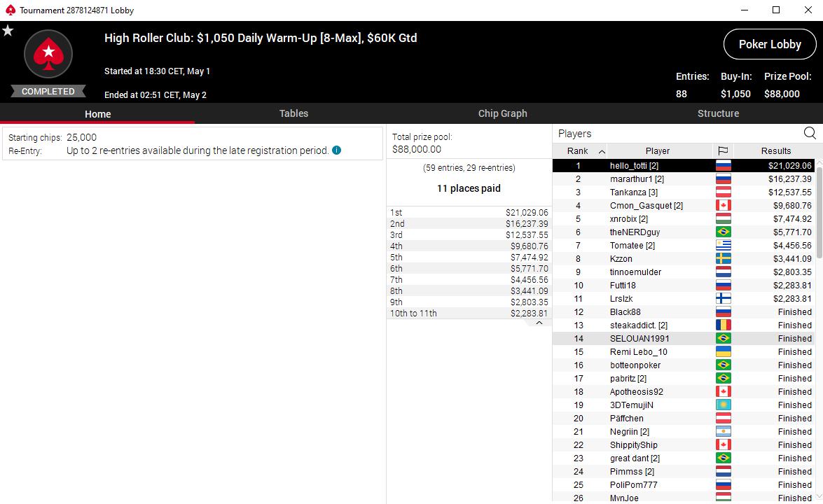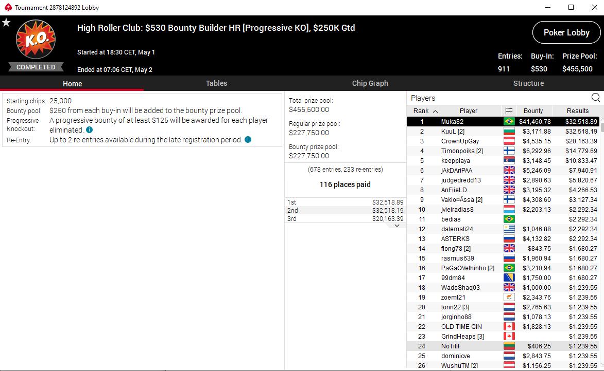 Den Sieg samt $32.518,89 Preisgeld und $41.460,78 an Bounties schnappte sich der Brasilianer Muka82, der im Heads-up gegen den Bulgaren KuuL ($32.518,19/$3.171,88) die Oberhand behielt. Der Österreicher CrownUpGay landete auf Platz drei und bekam neben $20.163,39 Preisgeld zusätzlich $4.535,15 an Bounties ausbezahlt.