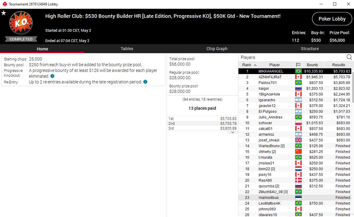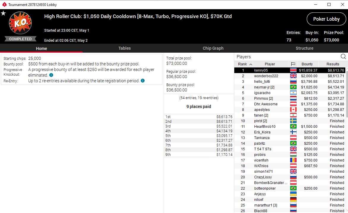 Den größten Preispool gab es wie gewohnt beim $530 Bounty Builder HR. Für das Progressive Knocktout-Turnier meldeten diesmal 678 Spieler, die den Preispool durch 233 Re-Entries auf $455.500 schraubten.