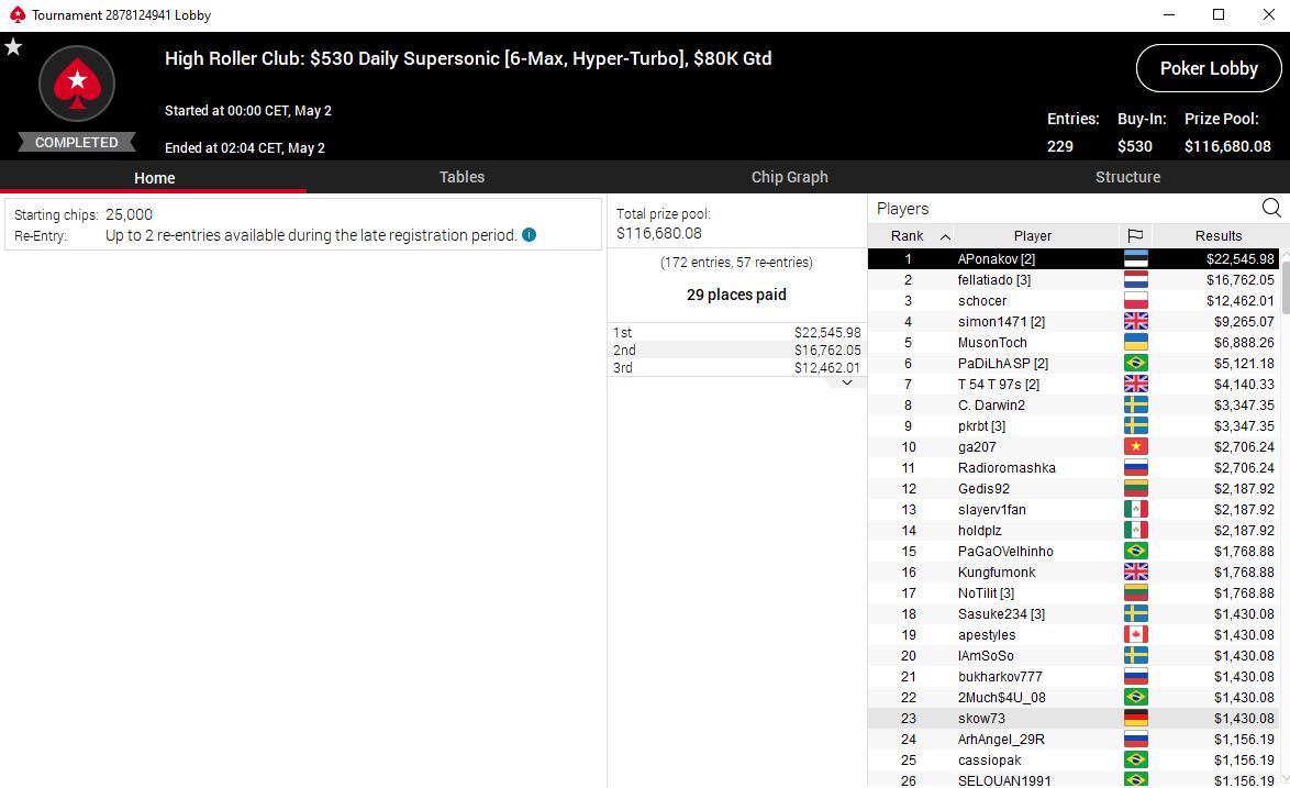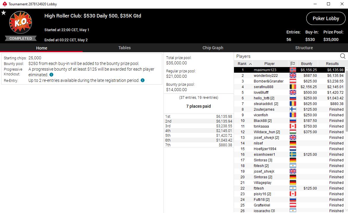 Knapp an einem Doppelschlag vorbeigeschrammt ist Tyler wonderboy222 Goatcher. Der Brite gewann zunächst das $1.050 Fast Friday nach einem Deal für $15.238,61 vor dem Schweden Niklas Lena900 Astedt ($14.629,81), musste sich später dann beim Daily 500 aber dem Norweger maximum123 ($6.135,98/$6.156,25) geschlagen und mit $6.135,94 plus $687,50 zufrieden geben.