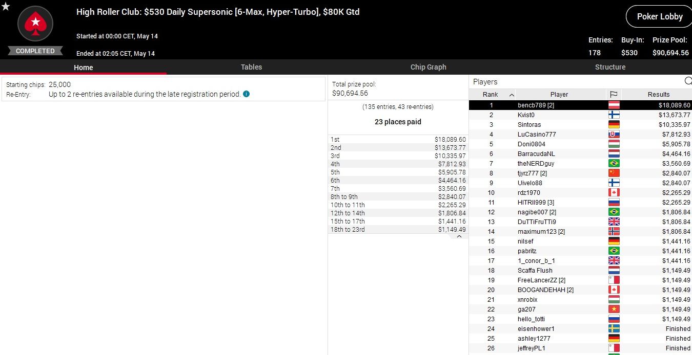 Beim $530 Supersonic setzte sich Ben „bencb789“ Rolle gegen sämtliche 177 Konkurrenten durch und räumte über $18.000 ab.