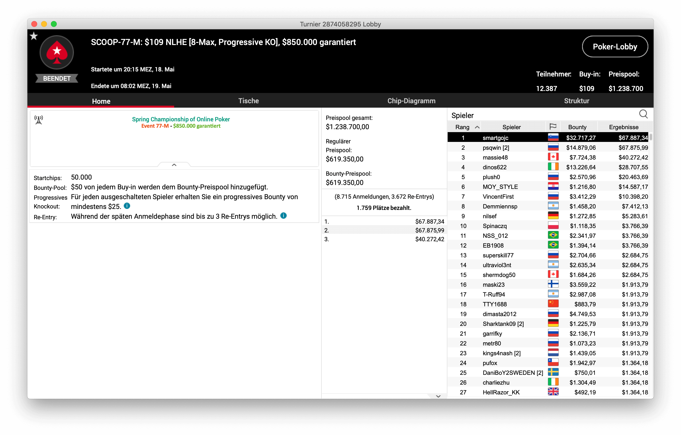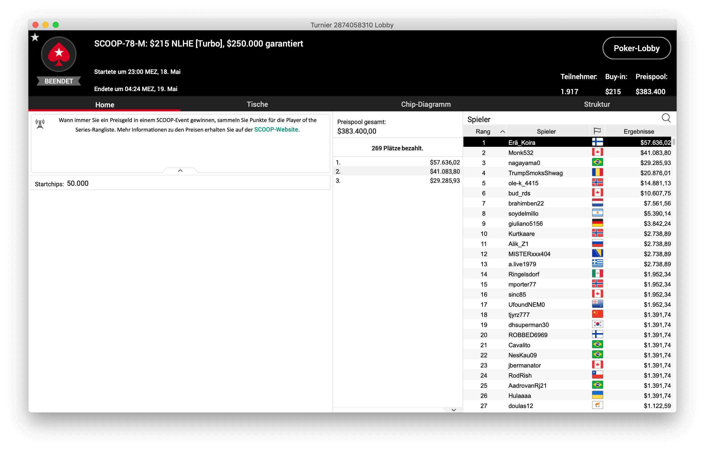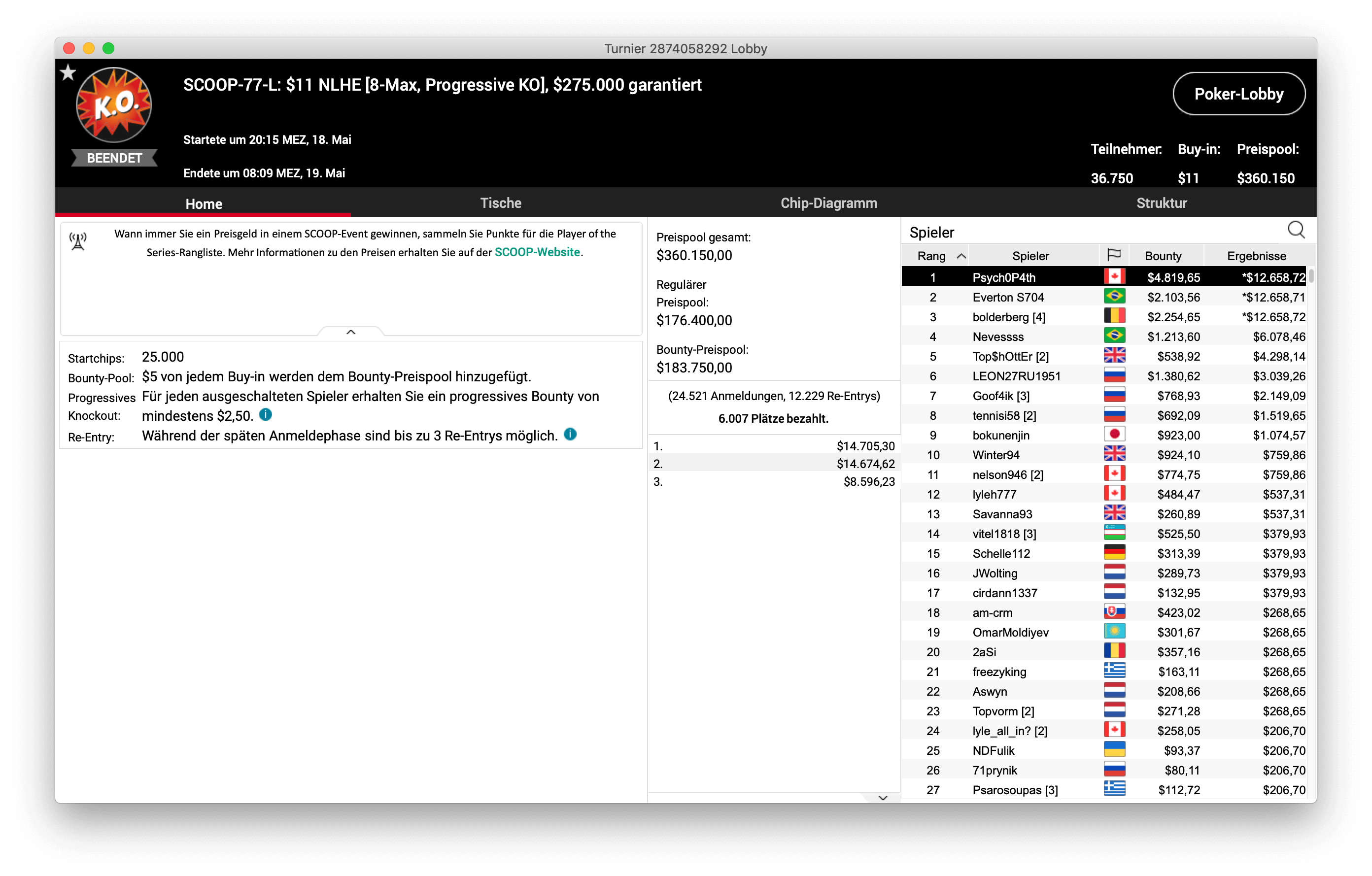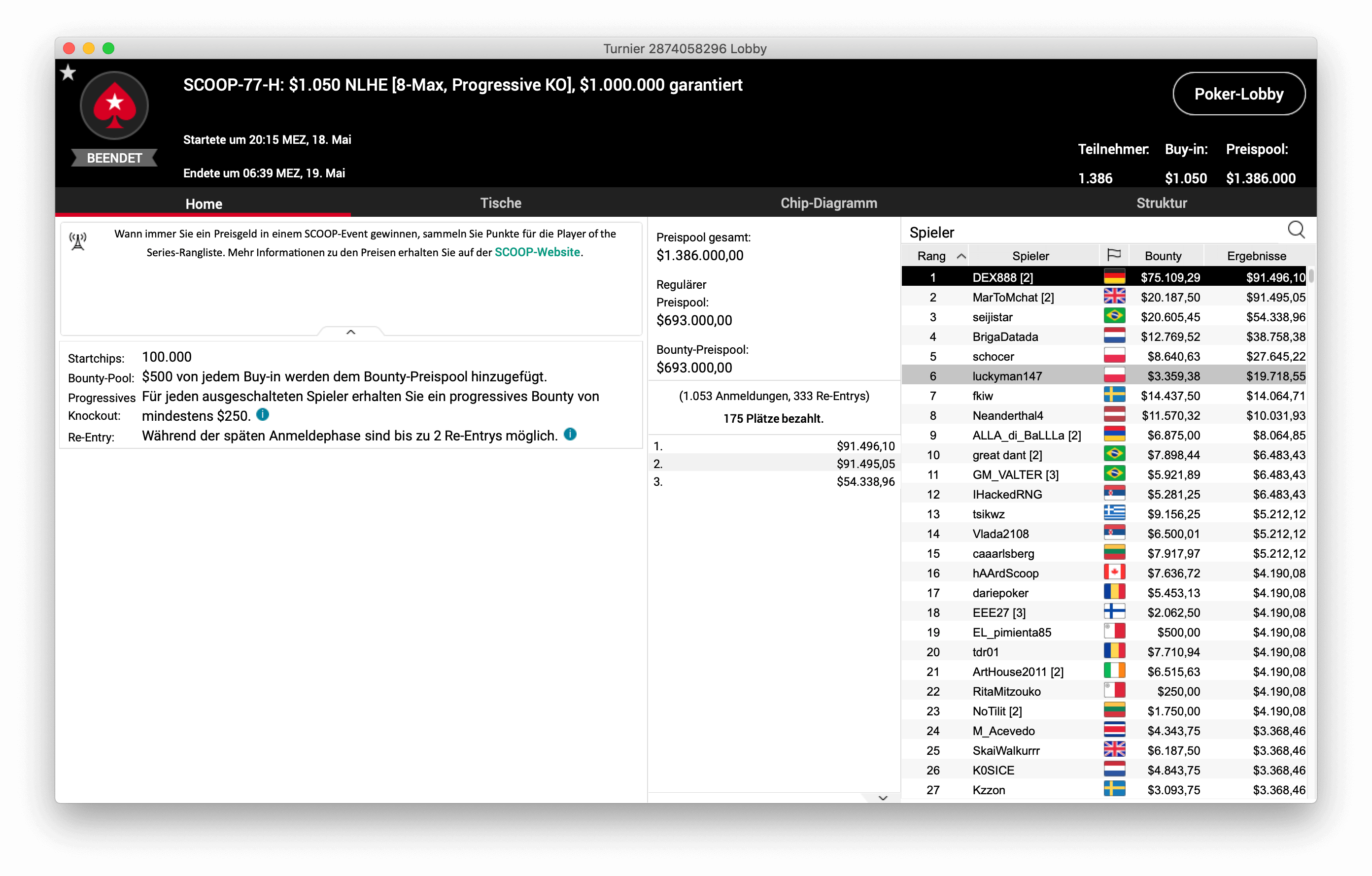 Er holte beim SCOOP-77-H nämlich gleich mal den Titel. Das Event mit $1.050 Buy-In empfing 1.386 Entries und schuf damit einen $1.386.000 Preispool, der auf die ersten 175 Plätze verteilt wurde. Für den Sieg gab es für „DEX888“ $91.496,10 und mit Bounties gewann der Deutsche $75.109,29. Als Runner-Up platzierte sich „MarToMchat“, der für seine Platzierung $91.495,05 bekam und mit Bounties $20.187,50 gewann.