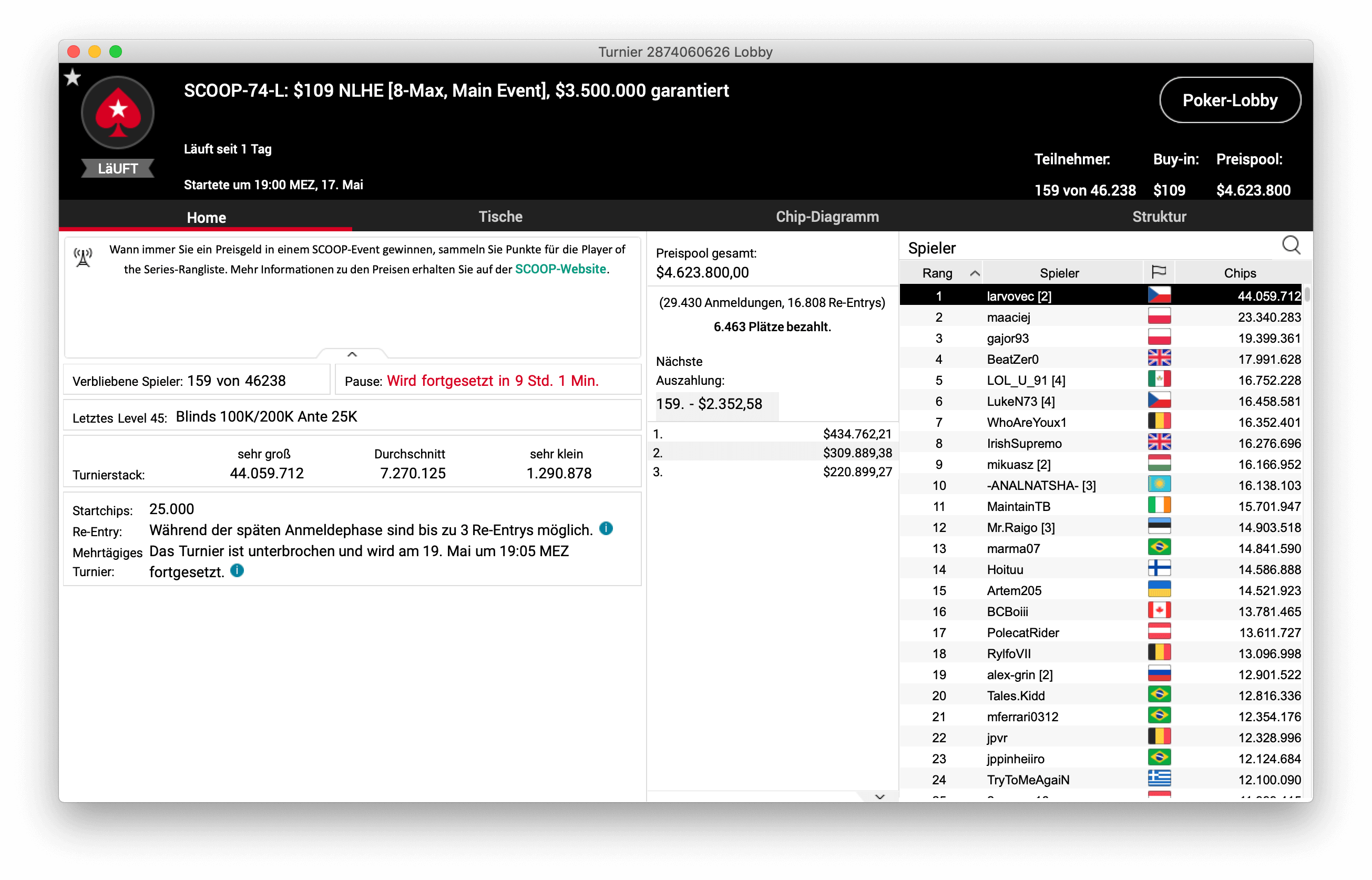 Und beim „kleine“ Main Event gibt es $4.623.800 im Preispool, das von 46.238 Entries stammt. Auf den Sieger warten hier $434.762,21. 159 Spieler sind noch im Rennen. Der Chipleader ist ein Tscheche. „larvovec“ führt mit 44 Mio Chips das Feld mit großem Abstand an. Mit 23 Mio Chips hat der Zweitplatzierte im Rennen, „maaciej“ nur 23 Mio Chips. Für die DACH-Garde sieht es nicht allzu rosig aus. Auf Platz 17 steht mit „PolecatRider“ der erste Österreicher mit 13,6 Mio Chips. Auch „2pacnrw16“ hat auf Platz 25 mit 12 Mio Chips noch gute Chancen.