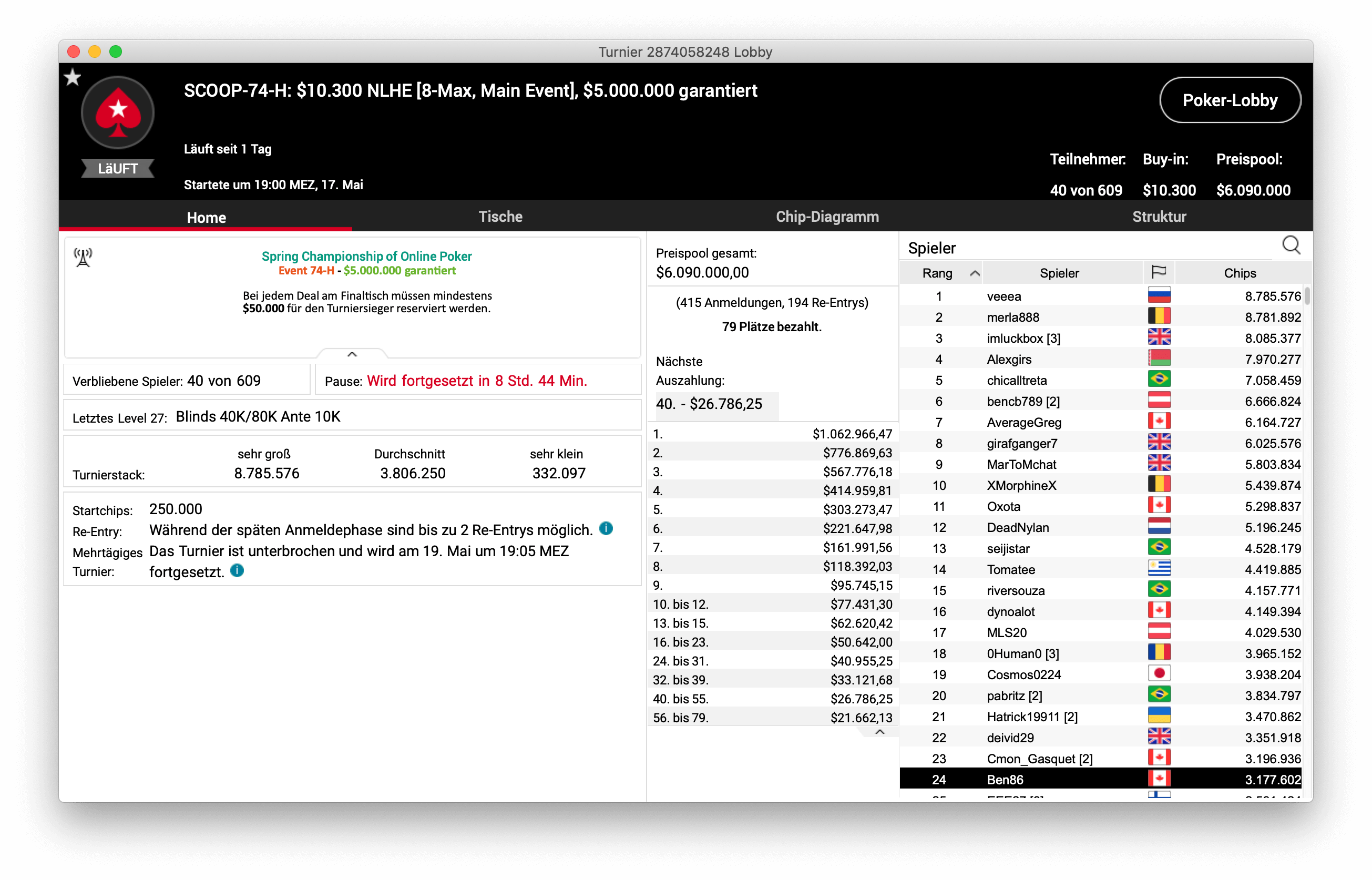 Beim $10.300 warten auf den Sieger für ein Online-Event absurd große $1.062.966,47 auf den Sieger. 609 Entries konnte das Highroller Main Event verbuchen, die von 415 Spielern erzeugt wurden. Der Preispool liegt bei $6.090.000. 40 Spieler sind noch übrig, insgesamt 79 Spieler konnten cashen.