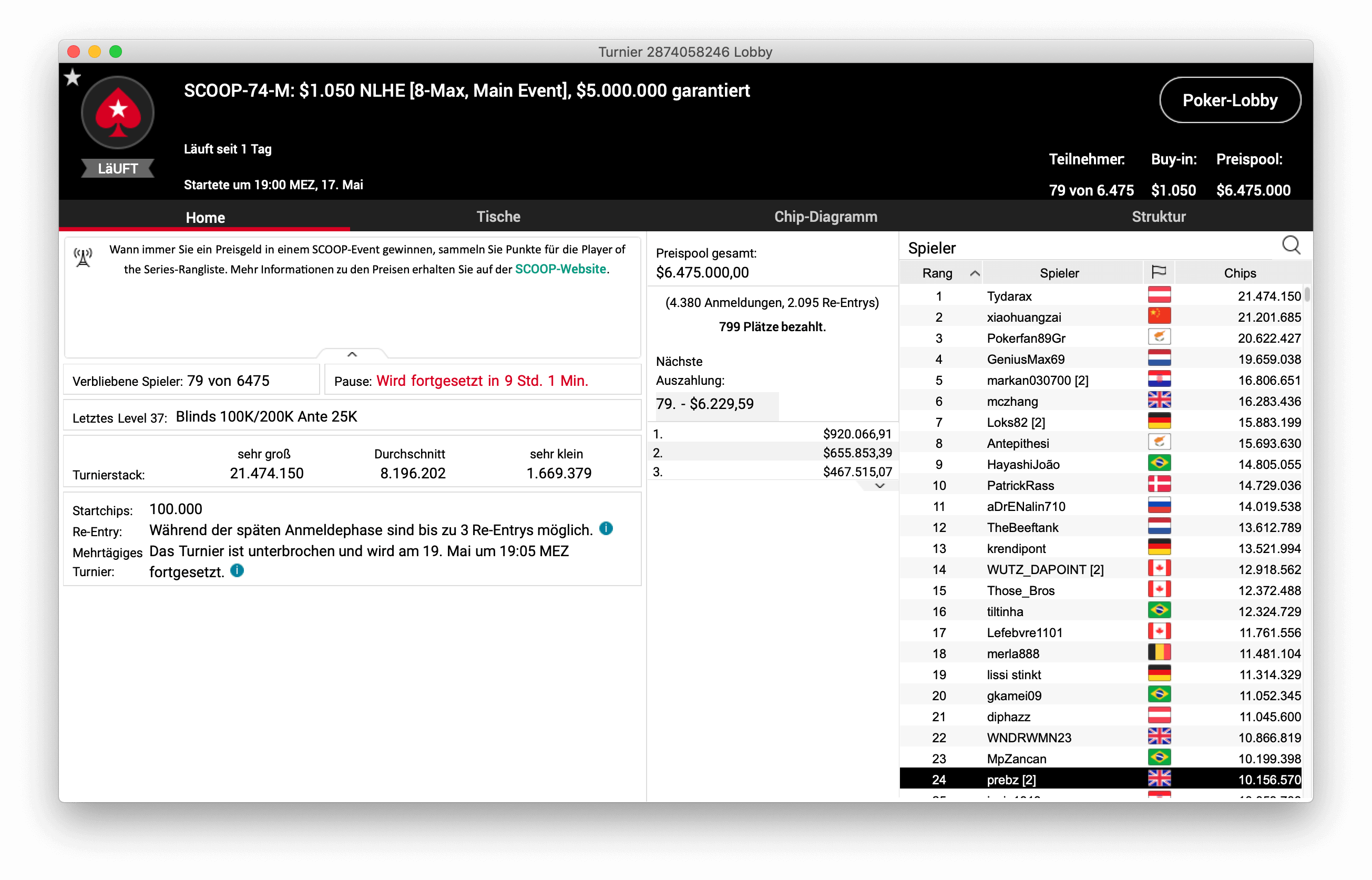 Das Turnier geht um 19:00 Uhr unserer Zeit weiter. Die Blinds liegen bei 40k/80k (10k Ante).