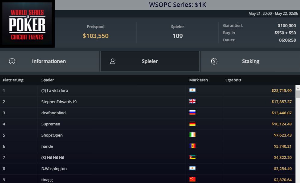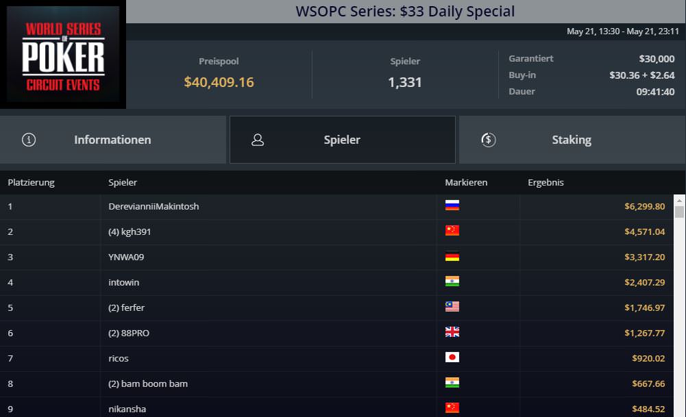 Starke Ergebnisse lieferten auch die beiden Deutschen YNWA09 und Supreme8. Erstgenannter schloss das$33 Daily Special auf Platz drei für $3.317,20 ab, Supreme8 beendet das $1K NLHE auf Platz vier für $10.124,48 Preisgeld.