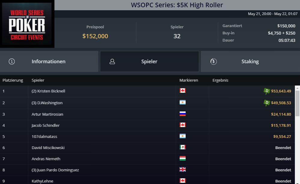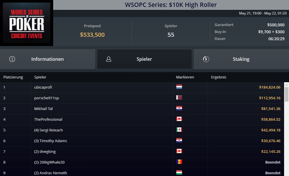 Das $10K High Roller samt $184.824,06 Prämie ging an den Niederländer ubicaprofi. Kristen Bricknell aus Kanada gewann eines der beiden $5K High Roller nach Deal für $53.643,49. Das zweite $5K High Roller und $67.641,34 ging ebenfalls nach Deal an 20BigWhale20 aus Andorra. Hier mischte die US-Amerianerin KathyLehne bis zum Ende mit und bekam als Runner-up gedealte $62.604,15 ausbezahlt.