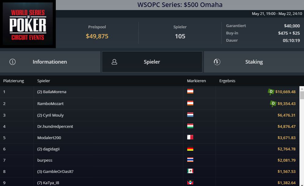 Beim $500 Omaha ging es um einen Preispool in Höhe von $49.875 und es gab einen Doppelsieg für Österreich. Nach etwas über fünf Stunden stand BailaMorena als Champion fest und kassierte aufgrund eines Deals $10.669,48 Preisgeld. Runner-up RamboMozart brachte der Deal $9.354,43 ein. Zudem landete hier der Deutsche dagidagii auf Platz sechs für $2.764,78 Preisgeld.