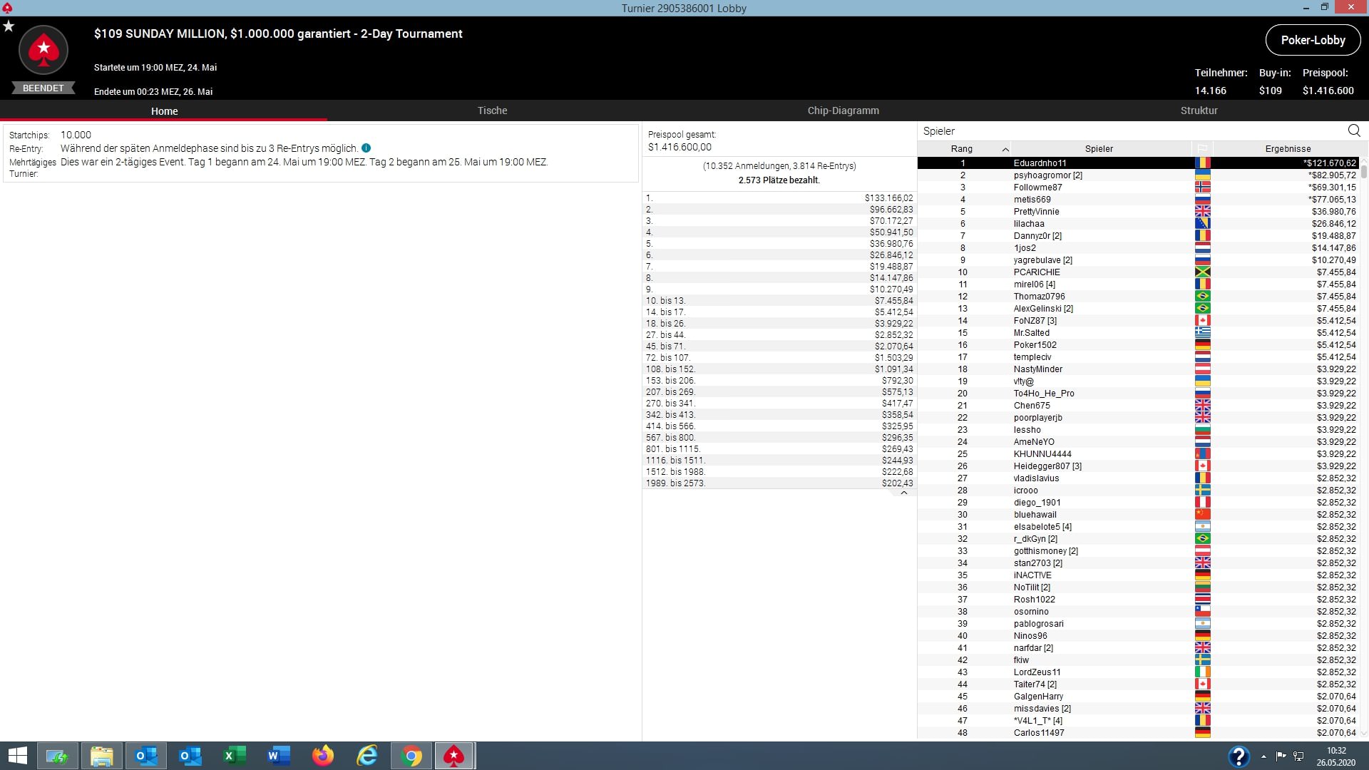 Am Montagabend fiel die Entscheidung bei der $109 Sunday Million. Die Besten der ehemals 14.166 Entries kämpften im Finale um ihren Anteil am $1.416.000 großen Preispool. Die Entscheidung fiel schließlich durch einen Deal der letzten Vier. Hier durfte sich der Rumäne „Eduardnho11“ über den offiziellen Sieg und $121.670 freuen. Bester DACH-Spieler wurde „Poker1502“ aus Deutschland auf Platz 16 für $5.412.