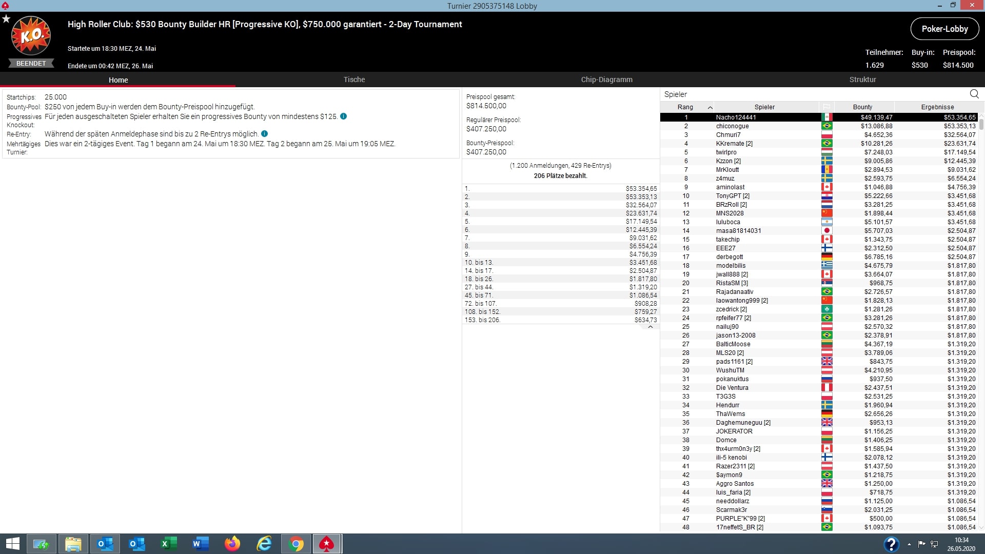 Ebenfalls in den Finaltag ging das $530 Bounty Builder High Roller, welches am Sonntag gestartet war. Hier kämpften die besten 28 der ehemals 1.629 Starts um den Löwenanteil des $814.500 großen Preispools. Für einen Cash reichte es bei „naily90“ (AUT – Platz 25 – $1.817 + $2.570 Bounties) und „derbegott“ (GER – Platz 17 – $2.504 + $6.785 Bounties). Der Sieg und $53.354 + $49.139 Bounties gingen an „Nacho124441“ aus Mexiko, der einen Start-Ziel-Sieg im Finale hinlegte.
