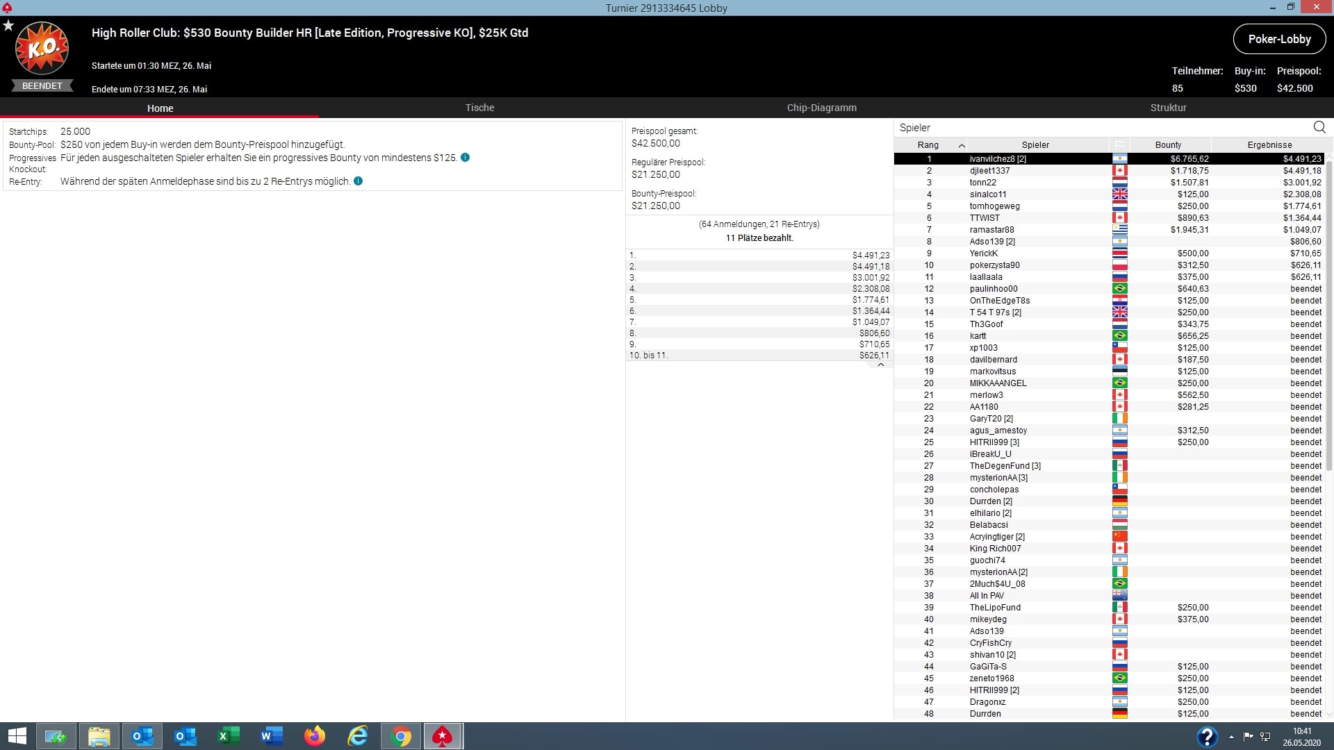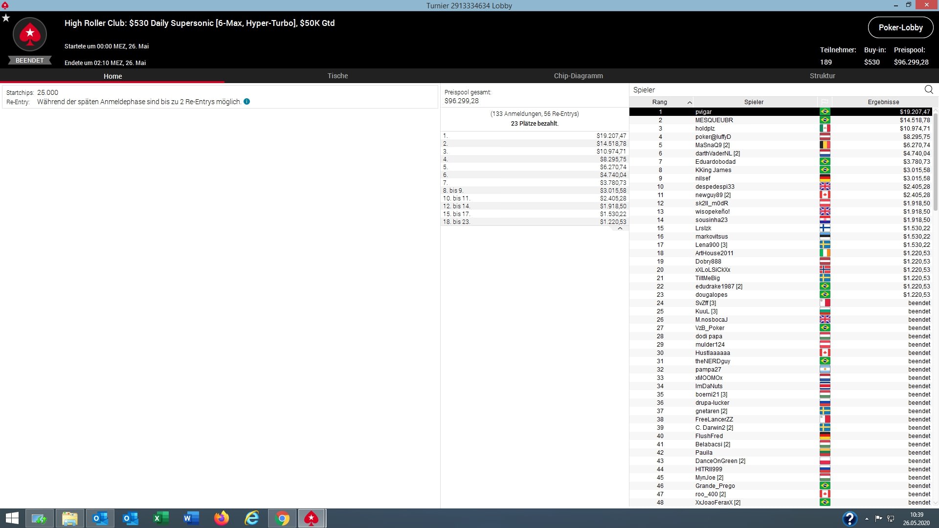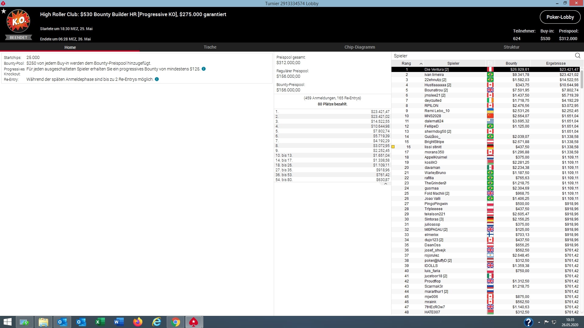 Wie gewohnt, gut besucht war auch das tägliche $530 Bounty Builder High Roller. Hier bauten 624 Entries einen Preispool von $312.000 auf. Der Sieg und $23.421 + $26.929 gingen an Diego „Die_Ventura“ Ventura aus Peru. Von unseren Jungs konnten „“BrightStripe“ (AUT – Platz 15 – $1.334 + $2.671 Bounties) und Christopher „lissi_stink“ Frank (GER – Platz 16 – $1.338 + $437 Bounties) cashen.