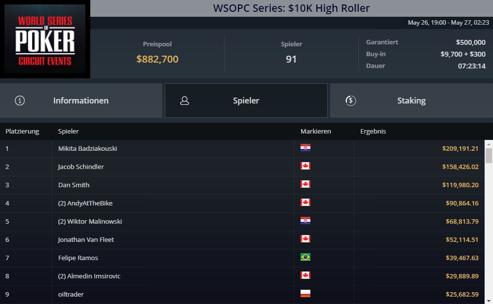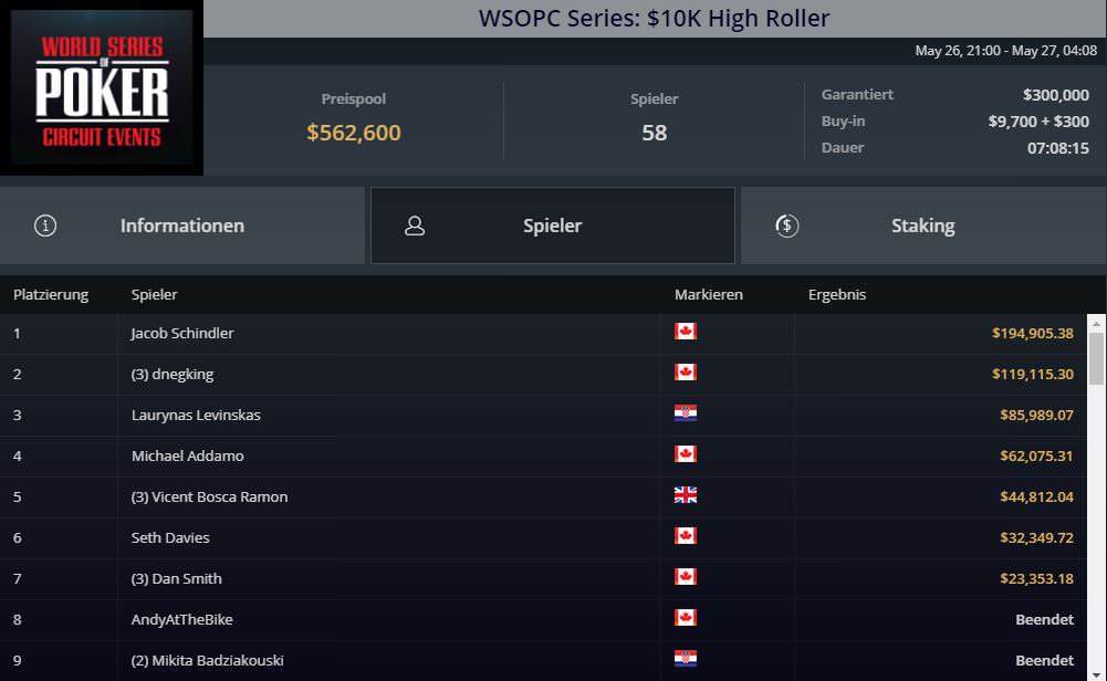 Hier ragte der US-Amerikaner Jakob Schindler heraus. Beim ersten $10K High Roller musste er noch mit Platz zwei für $158.426,02 hinter dem Weißrussen Mikita Badziakouski ($209.191,21) zufrieden sein, beim zweiten $10K HR gewann er dann aber vor dem Kanadier dnegking ($119.115,30) und räumte weitere $194.905,38 ab.