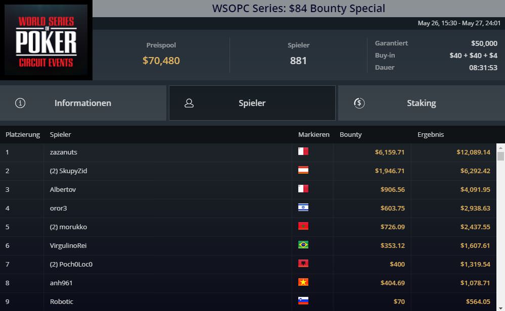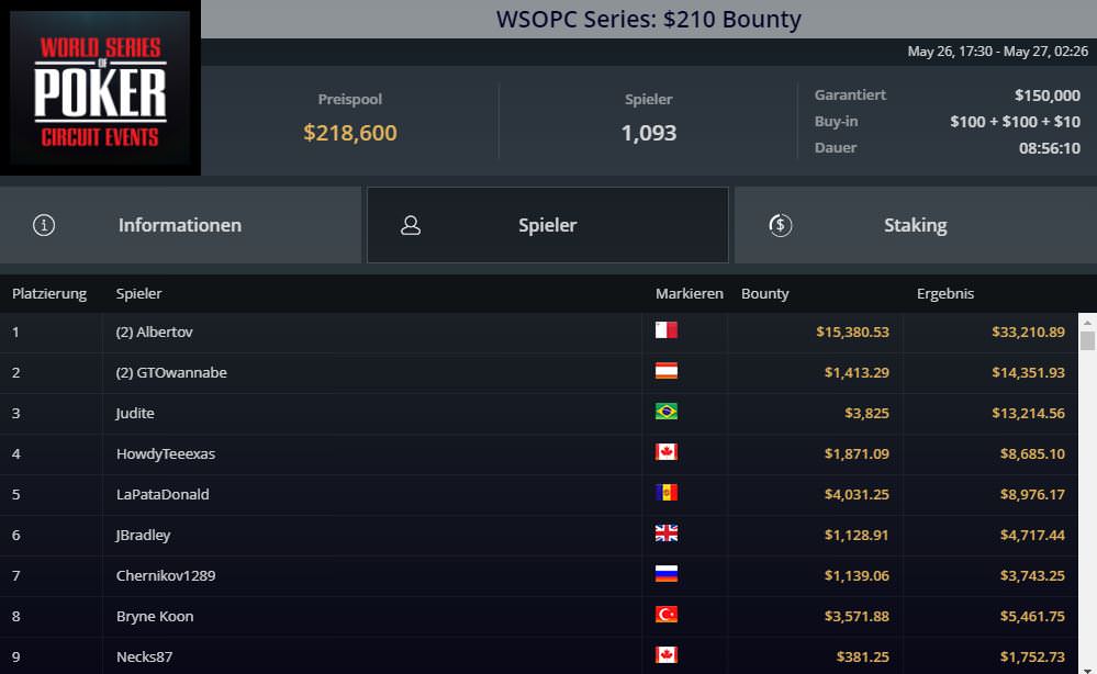 Dazu kamen noch einige zweite Plätze. Der Österreicher SkupyZid wurde Runner-up beim $84 Bounty Special für $8.239,13 Preisgeld plus $3.893,42 an Bounties. Der Deutsche ggtruque bekam als Zweiter beim $125 Daily Special $11.805,54 ausbezahlt. Für den Österreicher GTOwannabe brachte Platz zwei beim $210 Bounty $14.351,93 Preisgeld und zusätzlich $1.413,29 an Bounties. Einen weiteren zweiten Platz belegte Dwayne Sluis beim $500 Omaha, für ihn sprangen $7.587,47 Preisgeld heraus.