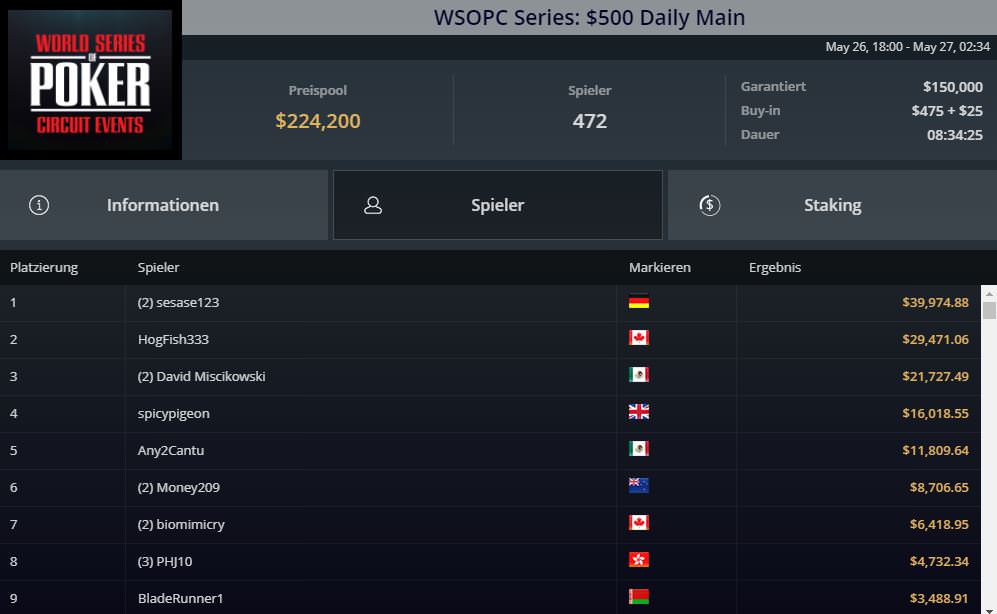 Aus deutschsprachiger Sicht gab es aber auch einen Turniersieg beim $500 Daily Main. Bei 472 Entries wurden $224.200 an Preisgeldern ausgespielt, davon kassierte der Deutsche sesase123 als Turniersieger satte $39.974,88.