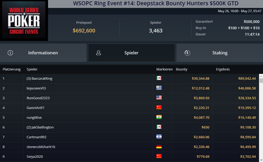 Das Hauptaugenmerk galt am Dienstag dem WSOPC Ring Event (#14) $210 Deepstack Bounty Hunters. Eine halbe Million war garantiert, letztlich wurden durch 3.463 Entries sogar $692.600 ausgespielt. Den Sieg holte nach knapp zwölf Stunden Spielzeit BaccaratKing aus Mexiko. Die Prämie betrug $89.042,44, dazu kamen $39.344,88 an Bounties. Bester Deutscher wurde stonecoldshark16 als Achter ($6.495,99/$2.330,46).
