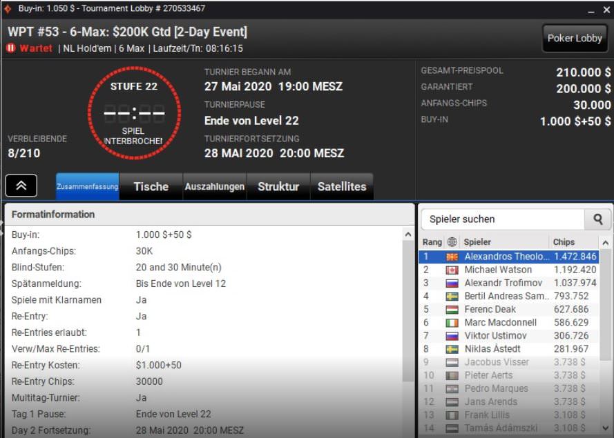 Beim $1.050 6-max kamen insgesamt 1.005 Entries zusammen, damit wurde die Garantie gerade so geknackt. 8 Spieler ziehen heute ins Finale ein, als Chipleader führt Alexandros Theolgis mit 1.472.846 Chips das Feld an. Auf Platz zwei und drei folgen Michael Watson (1.192.420 Chips) und Alexandr Trofimov (1.037.974 Chips). Dem Sieger winken $42.819.