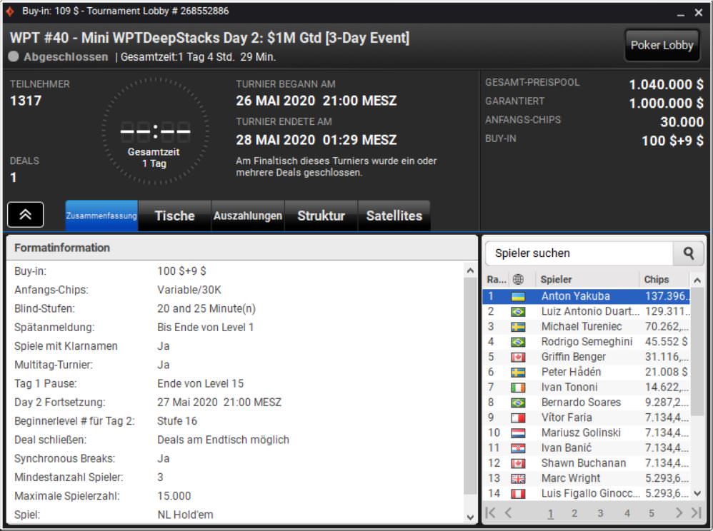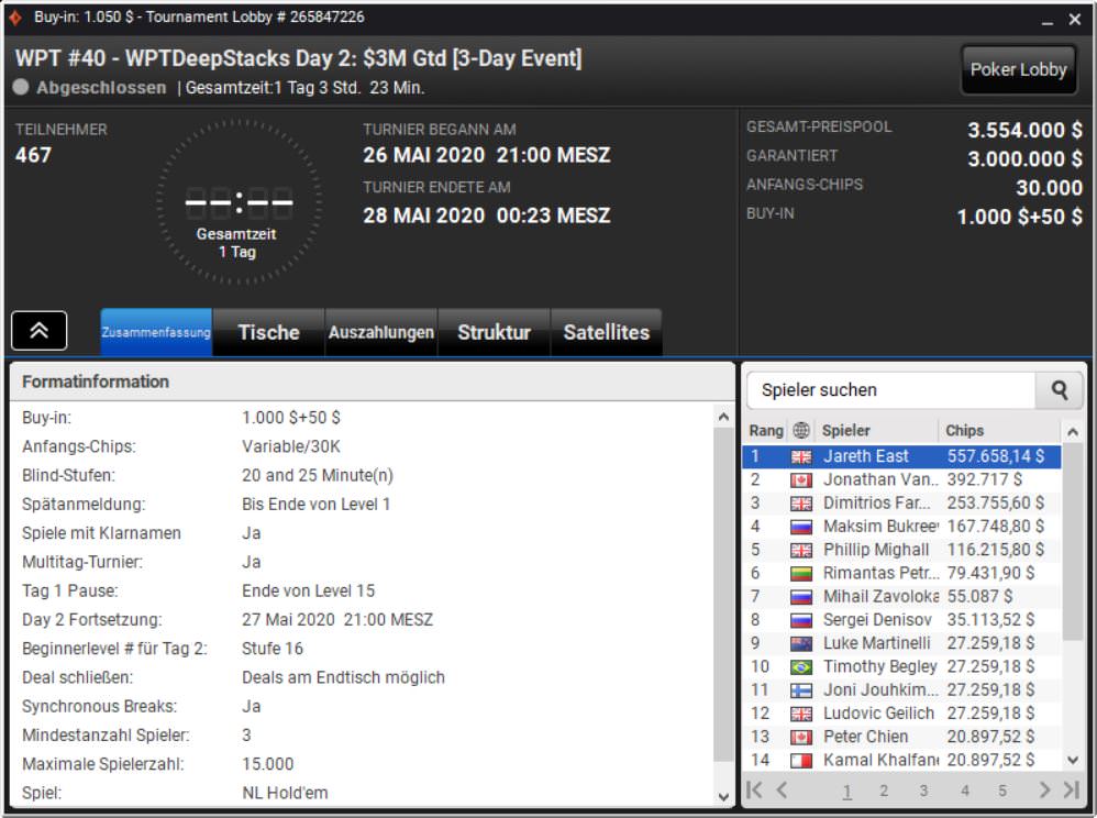 Beim $1.050 WPTDeepstacks kehrten 18 Spieler an die virtuellen Tische zurück. Der letzte Tag startete ohne Vertretung der DACH-Community. Im Heads-Up setzte sich schließlich Jareth East gegen Jonathan van Fleet ($392.717) durch. Platz drei geht an Dimitros Farmakoulis für $253.755,60. East darf sich als Gewinner über den Titel und satte $557.658,14 freuen.