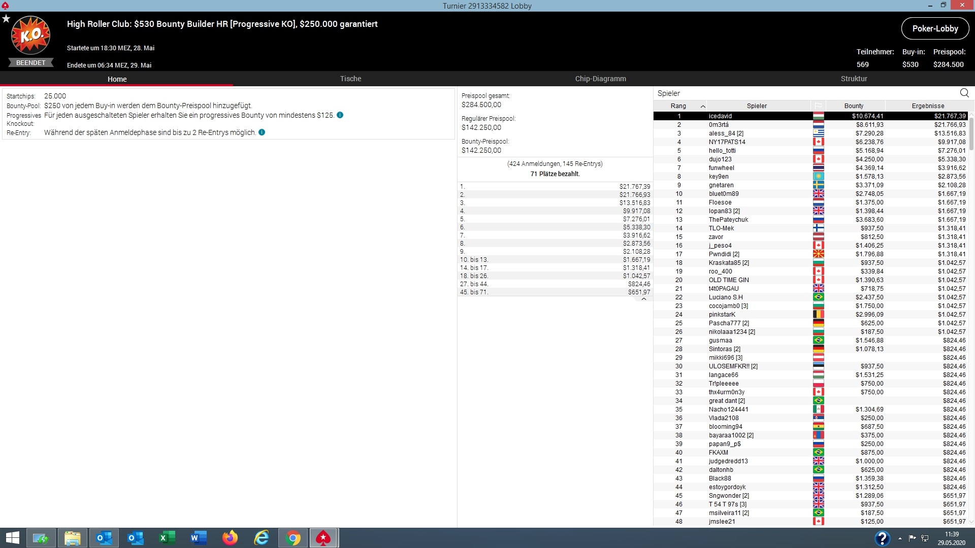 Der größte Preispool kam am Donnerstag im High Roller Club beim $530 Bounty Builder High Roller zusammen. Hier trugen 569 Entries ein Preisgeld von $284.500 zusammen. Den Titel und $21.767 + $10.674 Bounties konnte sich „icedavid“ aus Ungarn sichern. Platz 25 ging hier an „Pascha777“ (GER) für $1.042 + $625 Bounties.