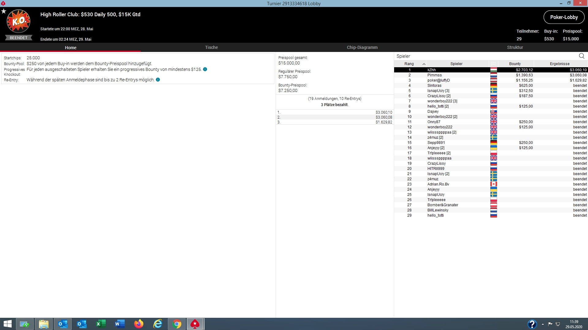 Eine kleine Runde gab es beim $530 Daily 500. Hier kauften sich nur 29 Spieler ein und kämpften um $15.000. Einen weiteren Sieg für Ungarn konnte „kZhh“ mit $3.060 + $2.703 Bounties verbuchen. Bester DACH-Spieler wurde „poker@luffyD“ auf Platz 3 für $1.629 + $1.156 Bounties.