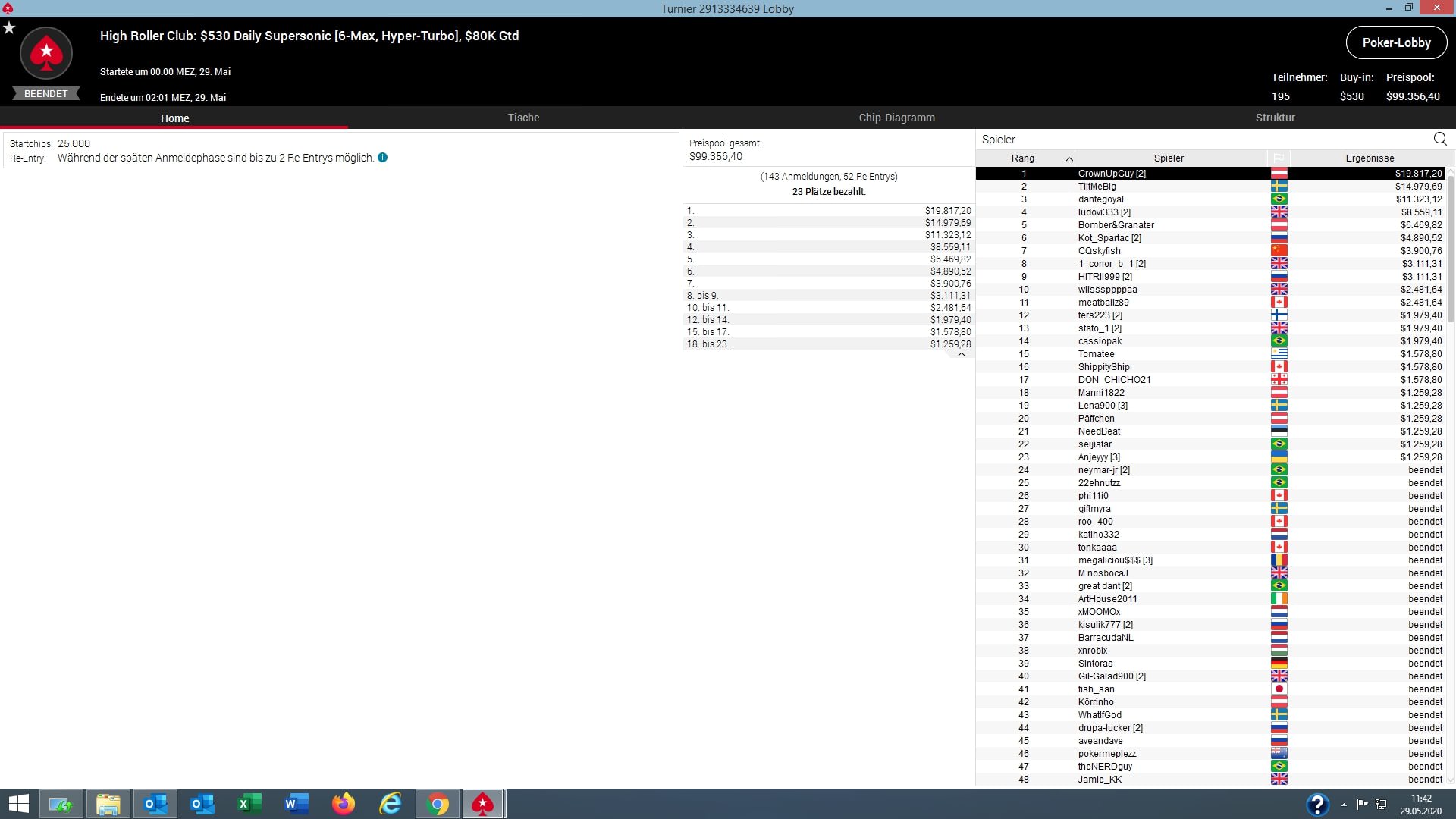 Seit dem Corona-Lockdown zählt Fedor „CrownUpGuy“ Holz (GER/AUT) wieder zu den regelmäßigen Gästen an den virtuellen High Stakes Tischen. Das er nichts verlernt hat, konnte er mit vielen Erfolgen in den letzten Wochen unter Beweis stellen. Am Donnerstag durfte er einen weiteren Titel seiner Sammlung hinzufügen. Er konnte sich beim $530 Daily Supersonic gegen 194 Gegner durchsetzen und ein Preisgeld von $19.817 gewinnen. Bei dem Turnier konnten „Bomber&Granater“ (AUT – Platz 5 – $6.469), „Manni1822“ (AUT – Platz 18 – $1.259) und Pascal „Päffchen“ Hartmann (GER/AUT – Platz 20 – $1.259) weitere Cashes für die DACH-Spieler verbuchen.