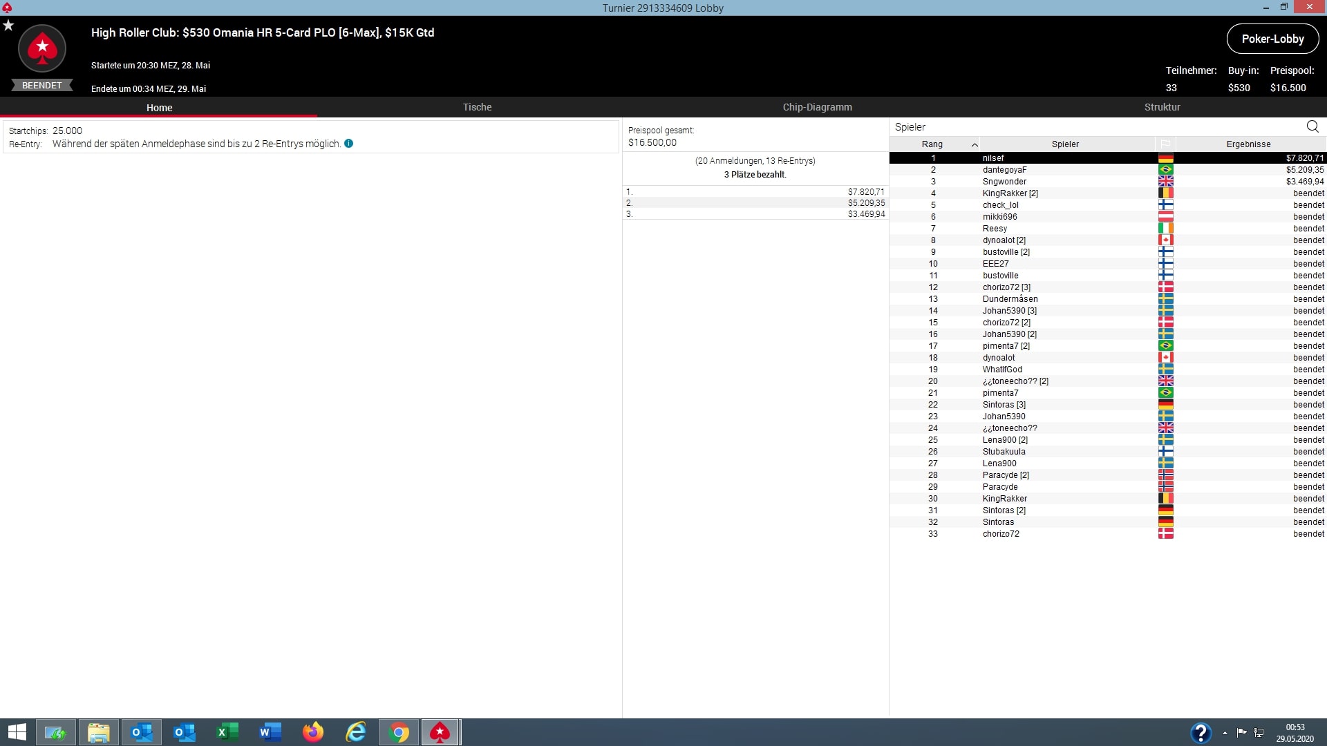 Das $1.050 Daily Cooldown zog 52 Online-Grinder an und so ging es um $52.000. Am Ende triumphierte der Russe „CrazyLissy“ und räumte $7.698 + $13.312 Bounties ab. Platz 6 holte sich der Deutsche „FrankfurterBozz“ für $1.375 + $2.750 Bounties. Ole „wizowizo“ Schemion (GER/AUT) musste als Bubble Boy das Turnier verlassen.