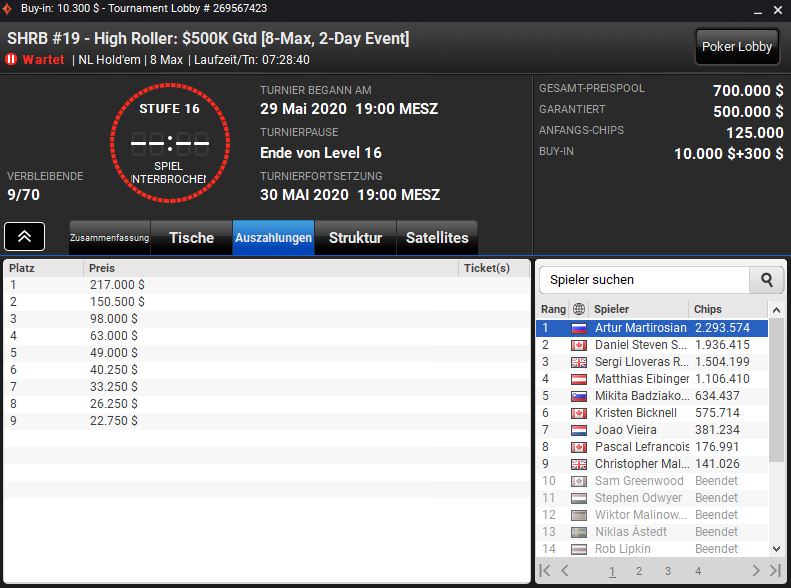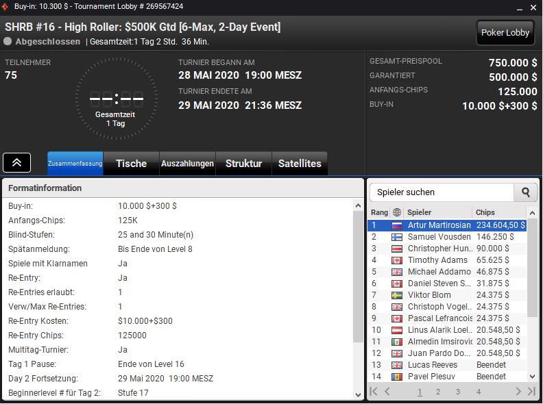Am Mittwoch unterlag der Russe Artur Martirosian beim $10.300 NLHE 6-Max (Event 11) Justin Bonomo aus Kanada, zwei Tage später machte eres bei einem weiteren $10.300 NLHE 6-Max dann besser, setzte sich im entscheidenden Heads-Up gegen den starken Finnen Samuel Vousden durch ($146.250) und räumte die Siegprämie in Höhe von $234.604,50 ab.