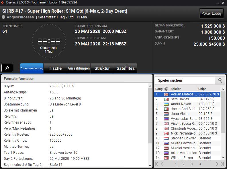 Das größte Turnier des Tages, ein $25.500 NLHE 6-Max, ging diesmal an den Spanier Adrian Mateos. Er bezwang im entscheidenden Heads-Up gegen den US-Amerikaner Seth Davies ($343.125) durch und bekam satte $527.509,70 ausbezahlt.