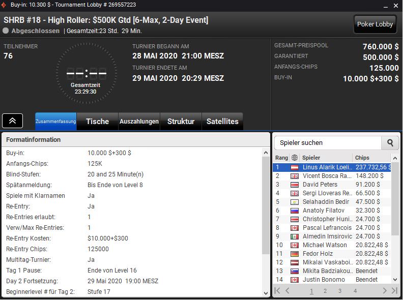 Nach seinem Mincash bei Event #16, sicherte sich der Wahl-Österreicher Linus Loeliger beim zweiten $10.300 NLHE 6-Max den Sieg. Dabei verhinderte er Heads-up das Doppel von Vincent Bosca ($148.200), der Event #10 gewonnen hatte, und bekam $237.732,56 Prämie aubezahlt.