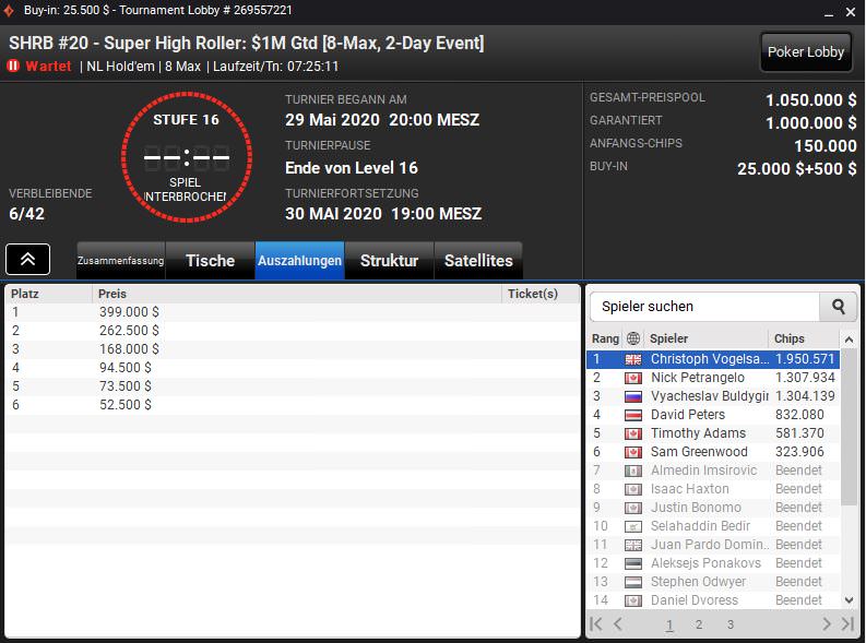 Christoph Vogelsang führt die letzten sechs Spieler, die auch den Preispool in Höhe von $1.050.000 unter sich aufteilen, in das Finale beim $25.500 NLHE 8-Max (#20). Laufkundschaft ist natürlich nicht dabei. Im Gegenteil, die Konkurrenz setzt sich aus Nick Petrangelo, Vyacheslav Buldygin, David Peters, Timothy Adams und Sam Greenwood zusammen.