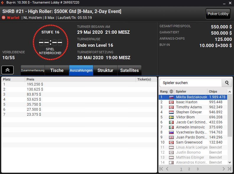 Beim zweiten $10.300 NLHE 8-Max (#21) führt der Weißrusse Mikita Badziakouski vor Isaac Haxton und Steve O’Dwyer. Viktor Blom ist Fünfter bei noch zehn Spielern und peilt Titelgewinn Nummer drei an. Der Preispool in Höhe von $550.000 wird auf die letzten sieben verteilt, drei Spieler gehen also noch leer aus.