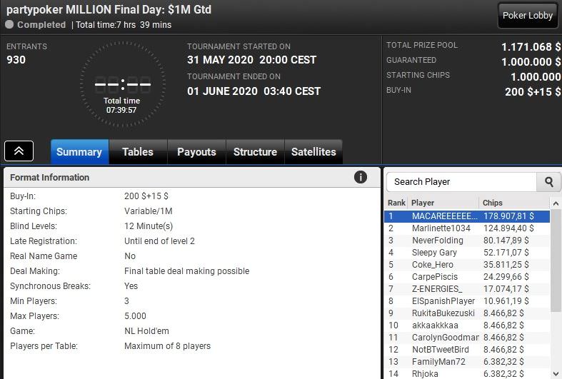 Noch mehr räumte „MACAREEEEE….“ ab, der die partypoker MILLION gewann und sich über knapp $179.000 Preisgeld freuen durfte.