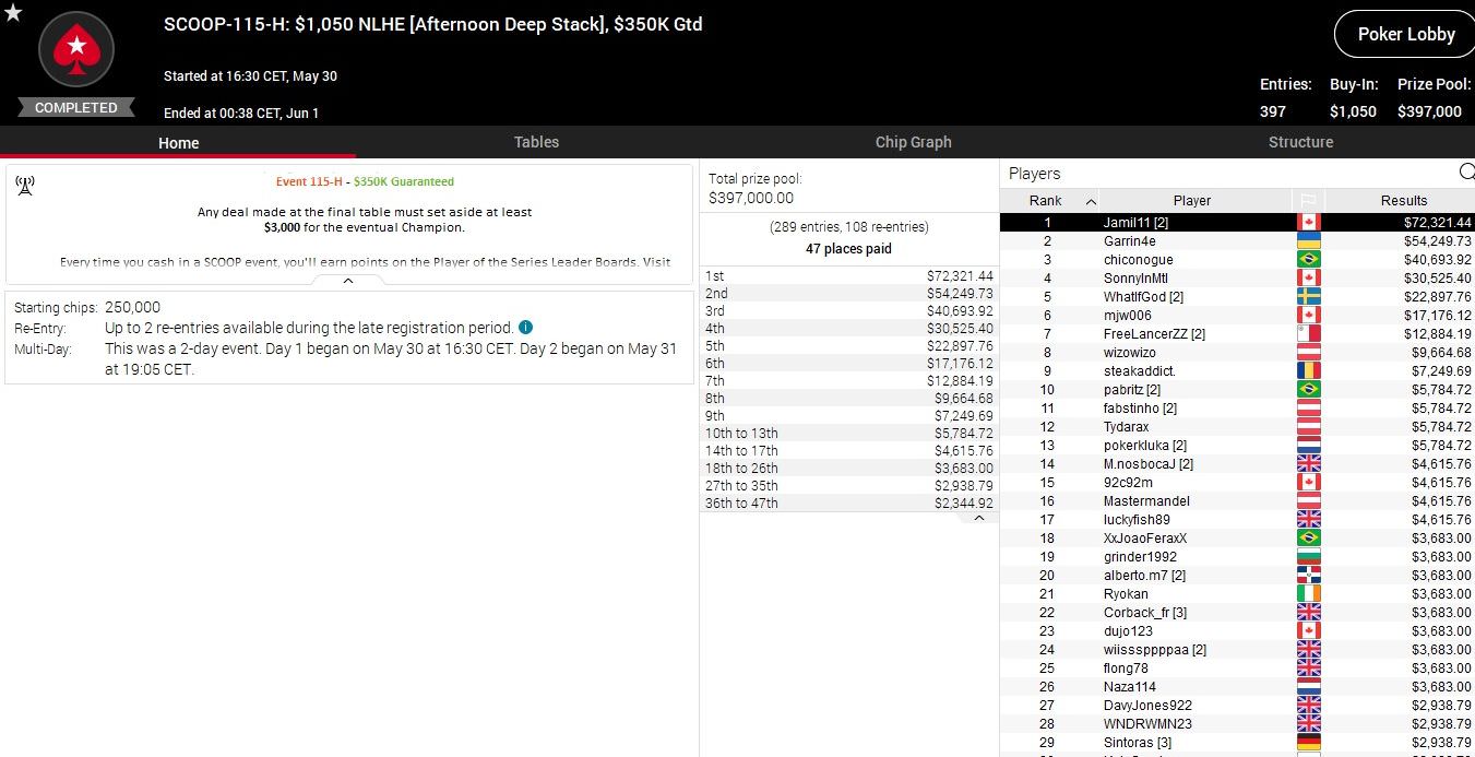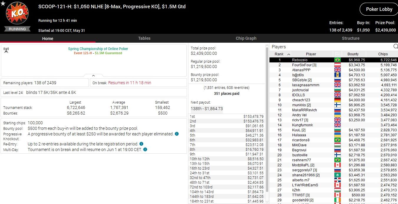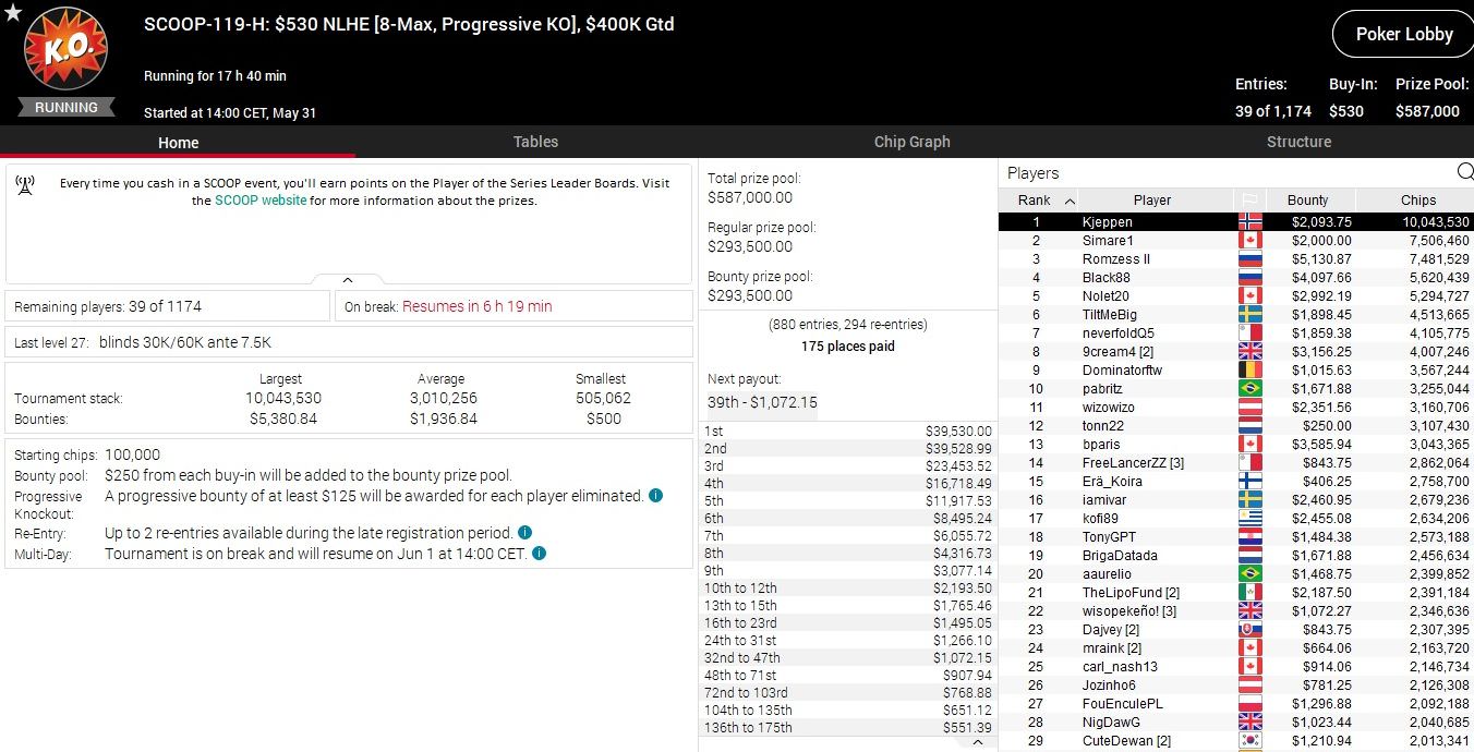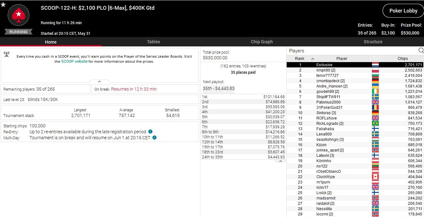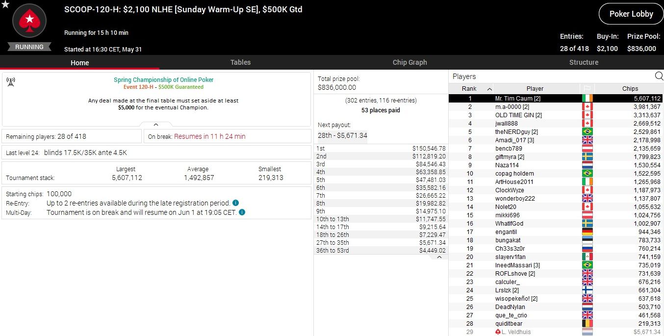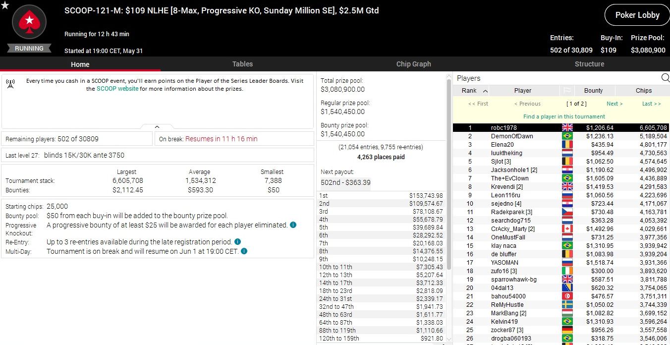 Außerdem wurden natürlich wieder einige Turniere gestartet, die am heutigen Finaltag der SCOOP entschieden werden. Dies betrifft auch die Sunday Million, die als SCOOP Event 121-M bei einem Startgeld von $109 wieder über 30.000 Spieler anzog.