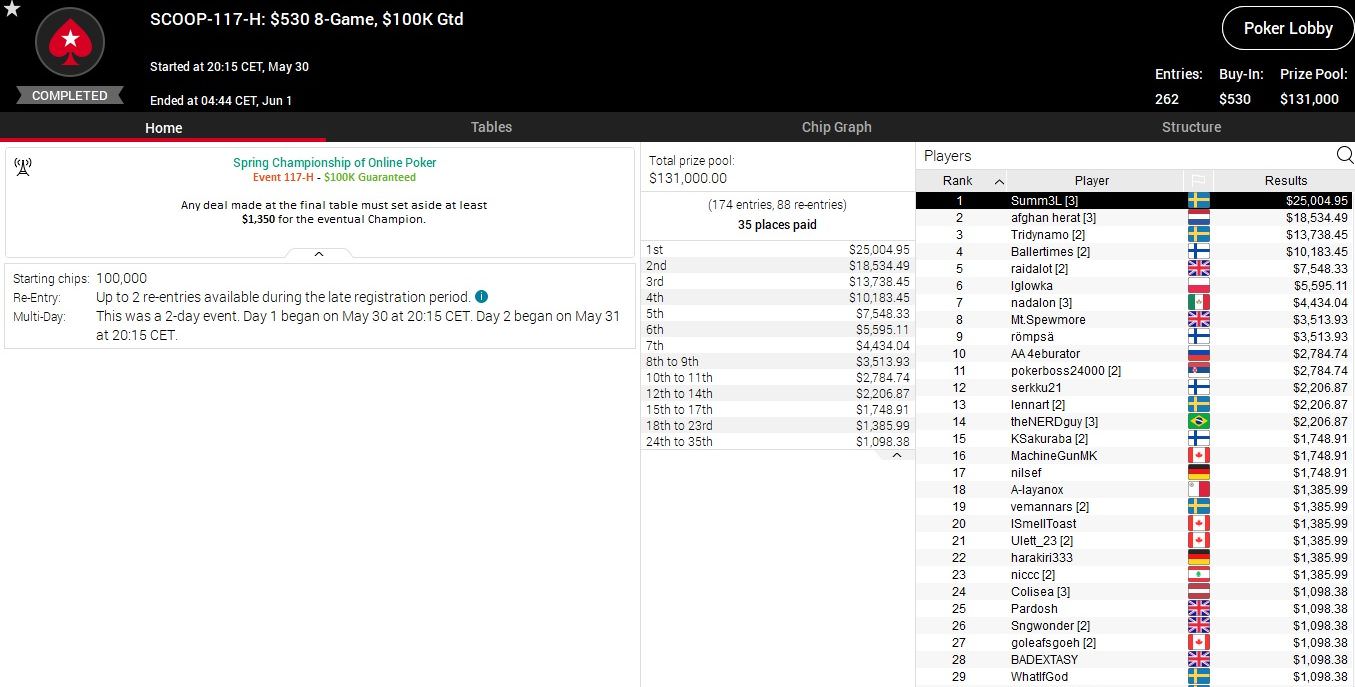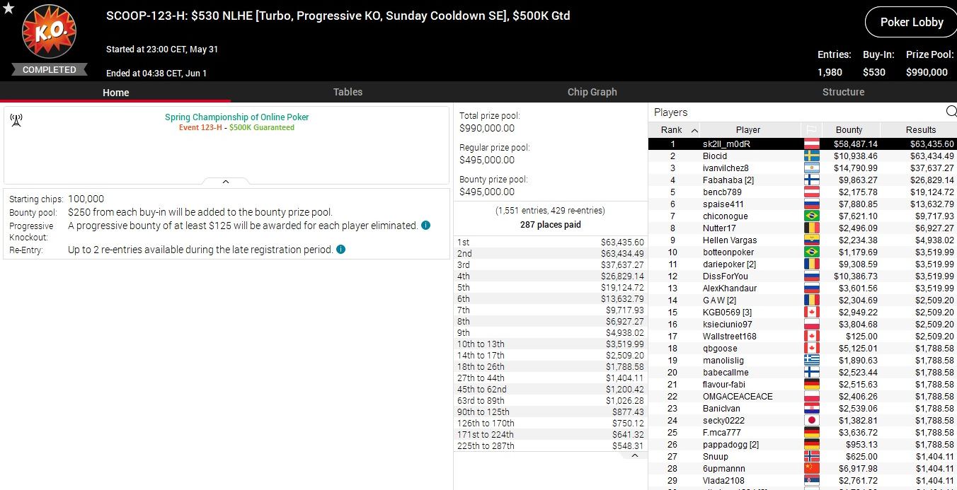 Bei Event 123-H, dem $530 Sunday Cooldown, ließ Oliver „sk2ll_m0dR“ Weis sämtliche 1979 Konkurrenten hinter sich und sicherte sich incl. Bountys ein Preisgeld von fast $122.000.