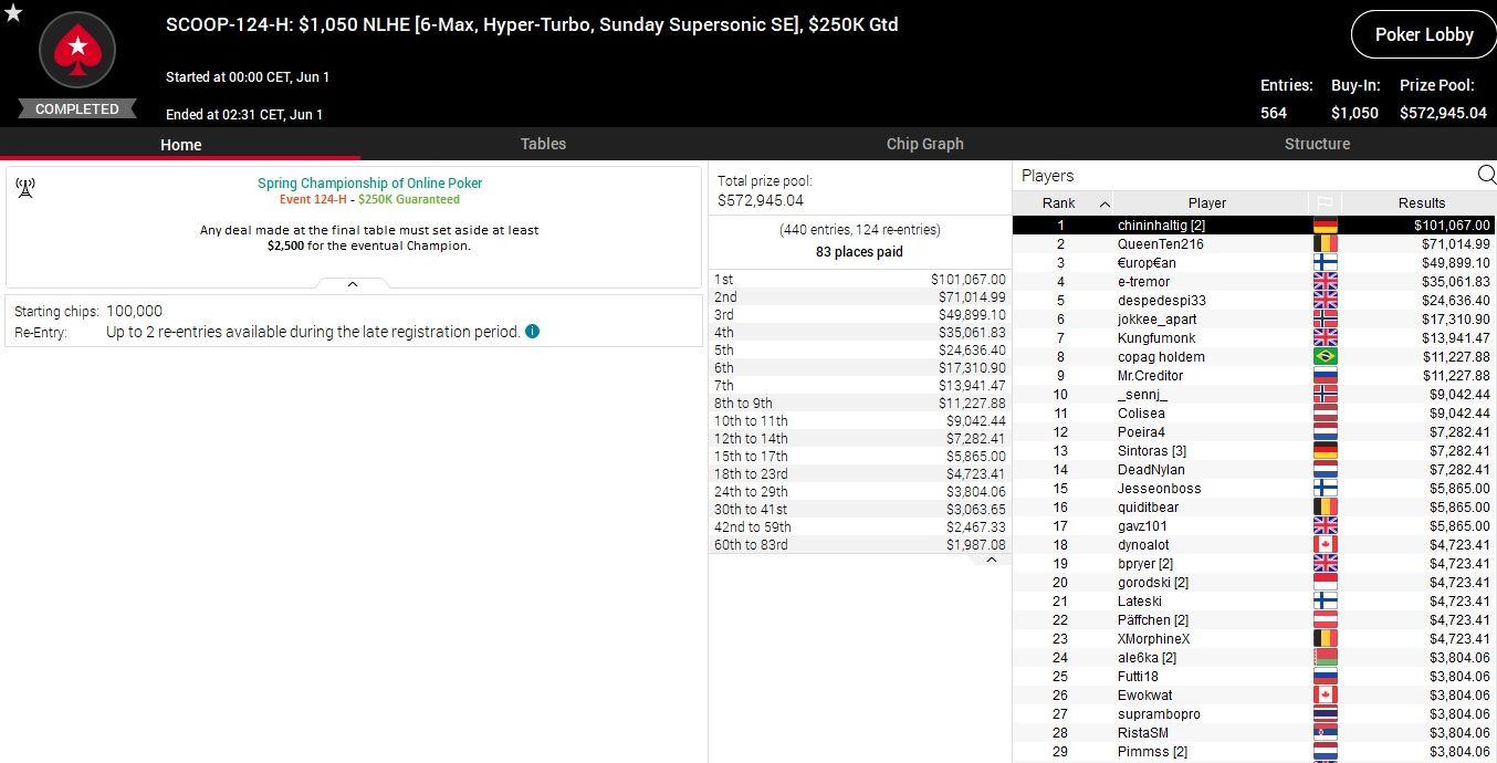 Gut zweieinhalb Stunden brauchte „chininhaltig“, um bei SCOOP Event 124-h, dem $2.100 Supersonic, alle anderen 563 Entries hinter sich zu lassen. Dafür wurde er mit über $101.000 reich belohnt.