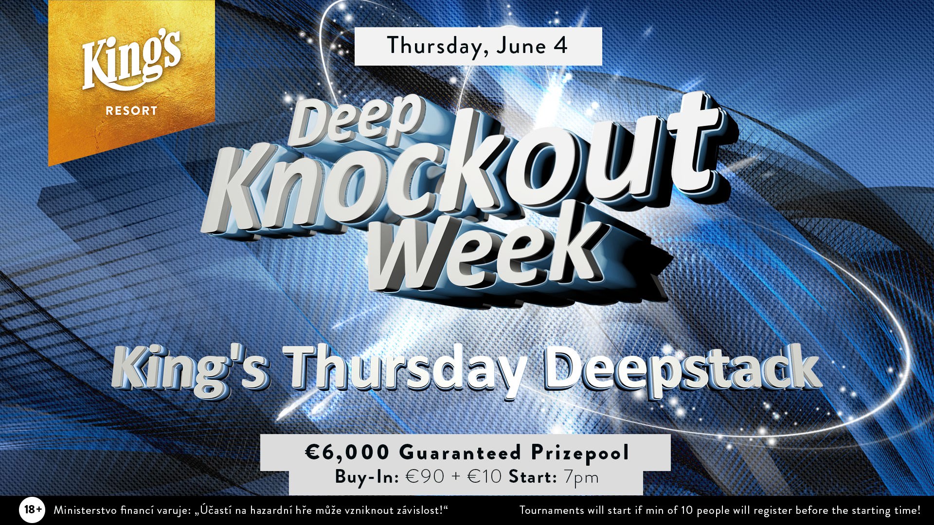 Am Donnerstag wird im King’s Resort ab 19:00 Uhr das €90+€10 King’s Thursday Deepstack mit einer Garantiesumme von €6.000 gespielt. Es geht los mit 50.000 in Chips und jeder Level dauert 25 Minuten. Es sind unlimited Re-Entries erlaubt und die Late-Registration ist für acht Level geöffnet.