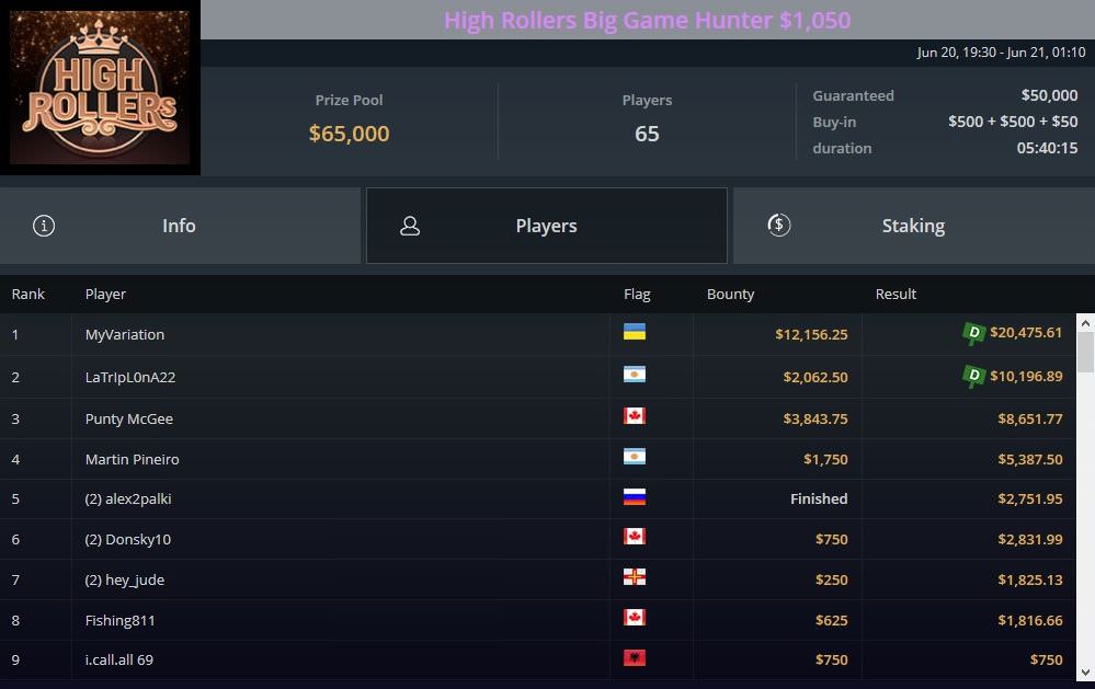 Größter Gewinner des Tages war „MyVariation“ aus der Ukraine, der beim $1.050 Big Game Hunter nach Deal über $32.000 abräumte.