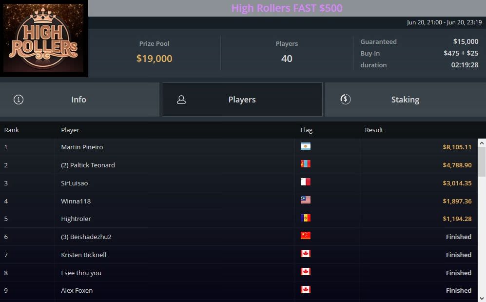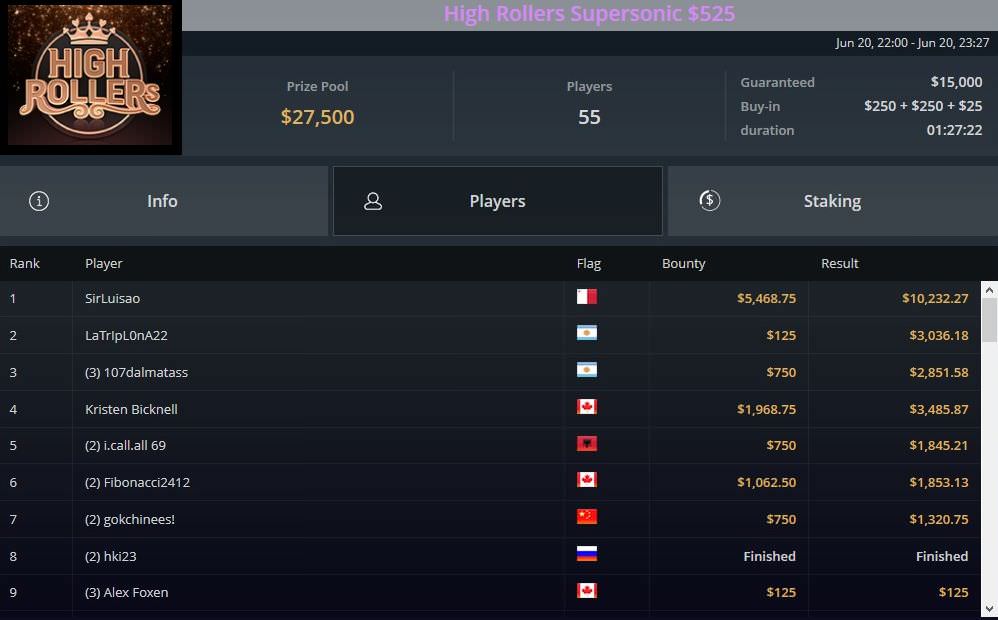Über $20.000 kassierte „S.Crosby“ bei seinem Sieg im $525 High Rollers Battle Royale, wo Jack Salter als Vierter rund $10.000 gewann und damit ebenfalls einen Erfolg verbuchen konnte.
